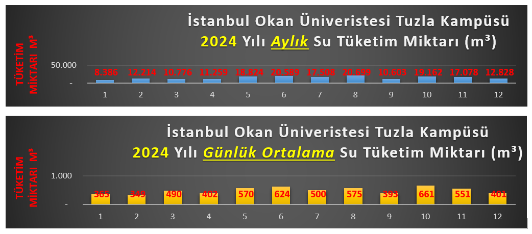 2024 yılı toplamsu tüketimi: 179926 m3 (2024 yılı için)Toplam kampüs popülasyonu: 14004 (2024 yılı için)