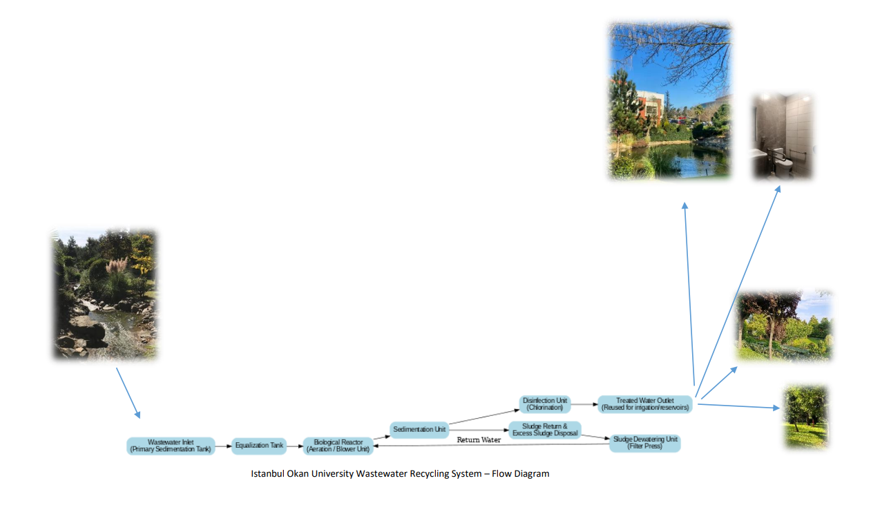 İstanbul Okan Üniversitesi’nde tüm binalarda atık su ve temiz su (yağmur suyu) için ayrı kanalizasyon sistemleri bulunmaktadır. Üniversitemizde kirli ve atık suyun çevreye karışmasını önlemek amacıyla bir su arıtma sistemi bulunmaktadır. Evsel atık sular, günlük 200 m³ kapasiteli 5 biyolojik arıtma sistemi ile arıtılmaktadır.
