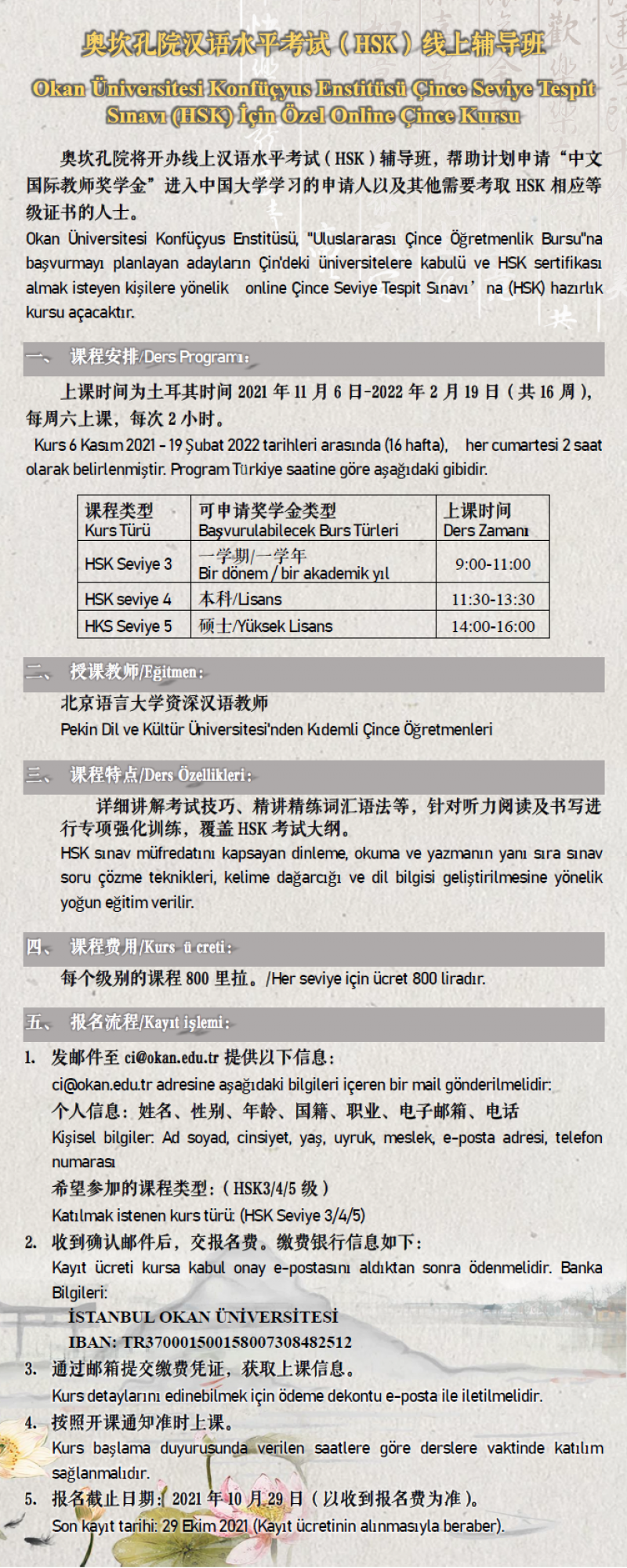 5. 报名截止日期:2021年10月29日(以收到报名费为准)。Son kayıt tarihi: 29 Ekim 2021 (Kayıt ücretinin alınmasıyla beraber).