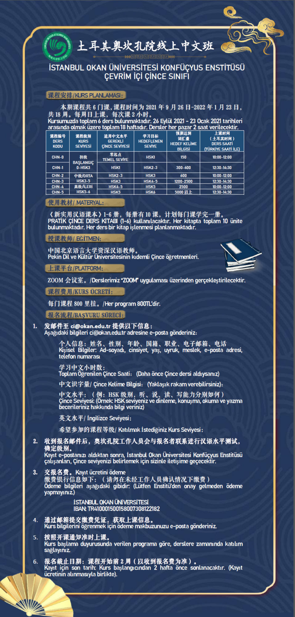 İstanbul Okan Üniversitesi Konfüçyus Enstitüsü 2021-2022 Yılı Çevrim İçi Çince Kursları