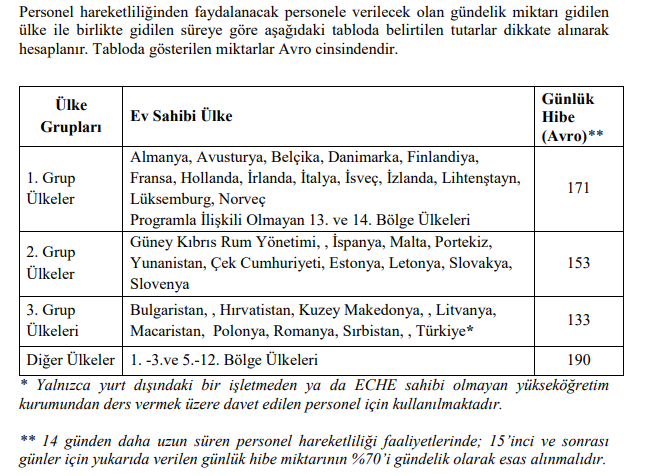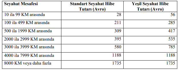 Personel Hareketliliği faaliyetinden faydalanan personele ödenecek seyahat gideri, AB Komisyonu tarafından sağlanan “Mesafe Hesaplayıcı” kullanılarak belirlenir. Mesafe hesaplayıcısı aracılığı ile gönderen kuruluşun bulunduğu/personelin yerleşik olduğu yerden, faaliyetin gerçekleşeceği yere kadar olan iki nokta arasının km değeri tespit edilir ve aşağıdaki tablo kullanılarak seyahat destek hibesi hesaplanır.