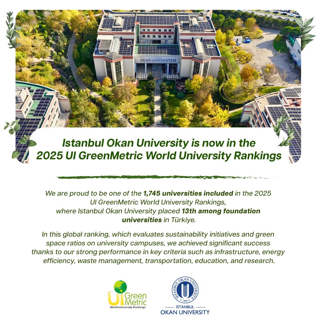 We are proud to be one of the 1,745 universities included in the 2025 UI GreenMetric World University Rankings, where Istanbul Okan University placed 13th among foundation universities in Türkiye.