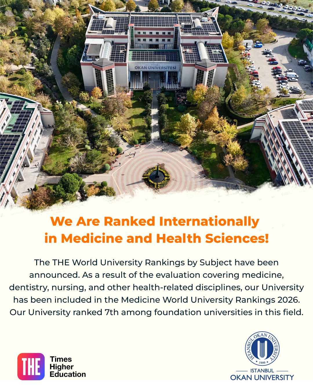 The THE World University Rankings by Subject have been announced. As a result of the evaluation covering medicine, dentistry, nursing, and other health-related disciplines, our University has been included in the Medicine World University Rankings 2026. Our University ranked 7th among foundation universities in this field.