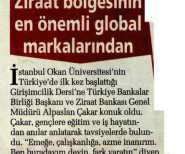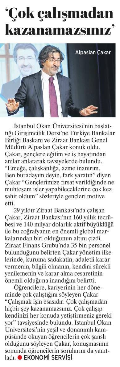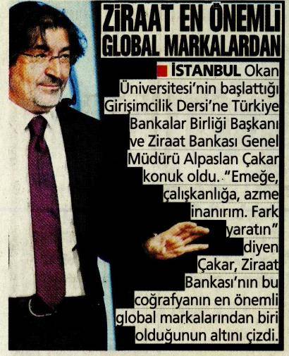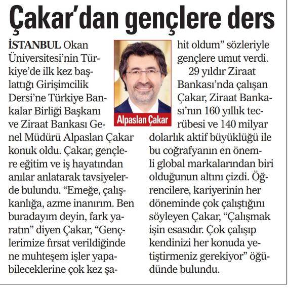 Ziraat Bankası Genel Müdürü Alpaslan Çakar’ın konuk olduğu Girişimcilik Dersimiz Sabah, Milliyet, Akşam ve Takvim gazetelerinde yansıma aldı.