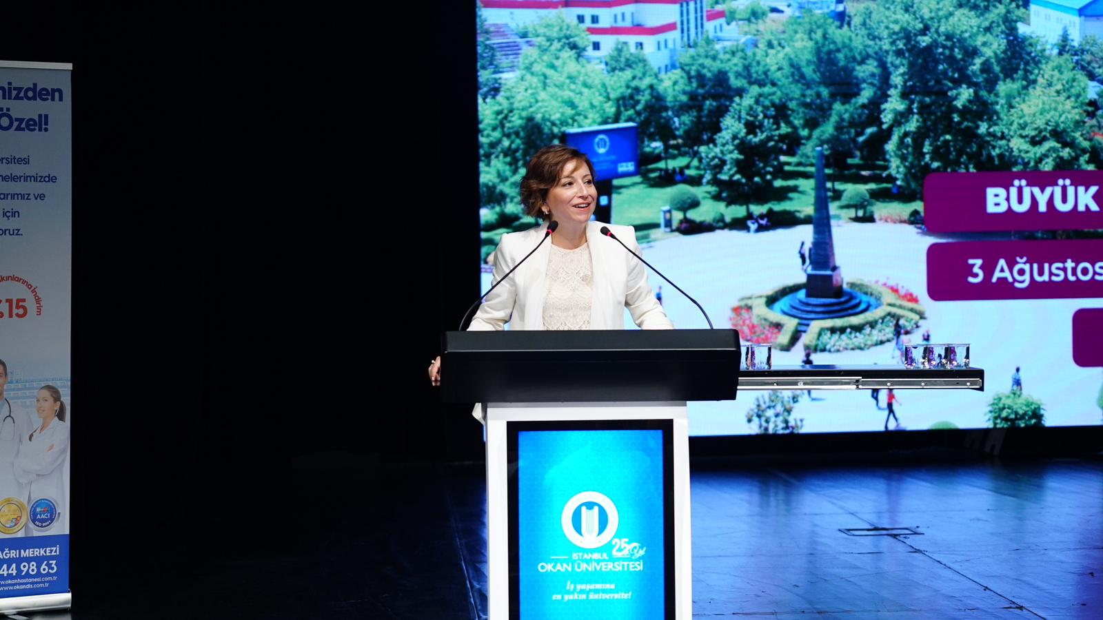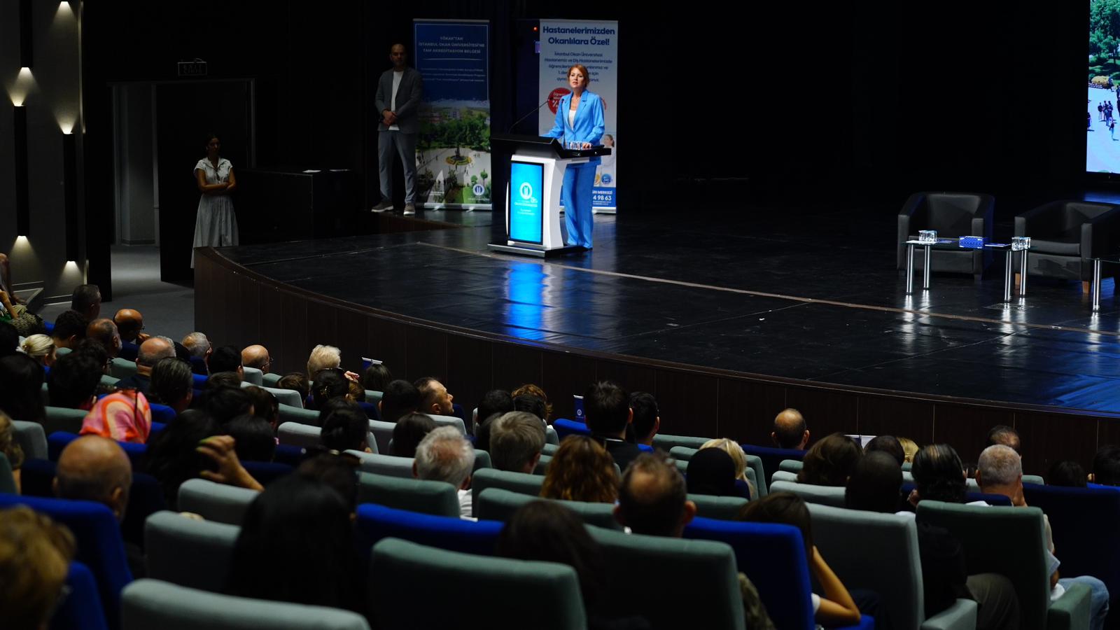 Rektörümüz Prof. Dr. Güliz Muğan açılış konuşmasında “Günümüz dünyası geleceğin insanını, evrensel insanı arıyor. Biz İstanbul Okan Üniversitesi olarak iş yaşamına en yakın üniversite sloganıyla işte sizi bu yeni dünyaya hazırlamak için buradayız. 22 ülkeden 87 üniversiteyle Erasmus anlaşmamız, 300’den fazla üniversiteyle ISEP, 25 farklı ülkeden 39 üniversiteyle çift diploma anlaşmamız mevcut. Uluslararası deneyimi yerinde yaşamınızı istiyoruz ama bir yandan da dünyayla sizi teknolojinin küresel boyuttaki dijital mecralarında buluşturuyoruz. Türkiye’nin en güçlü kariyer merkeziyle Türkiye’de ilk ve tek patenti olan Kariyer ve Yaşam Programı’nda sizleri iş hayatına hazırlıyor, bir yandan okurken bir yandan çalışmanızı sağlıyor, yapay zeka, metaverse gibi derslerin yanı sıra sosyal derslerle de değişim hızına uyum sağlamanızı hedefliyoruz” dedi.