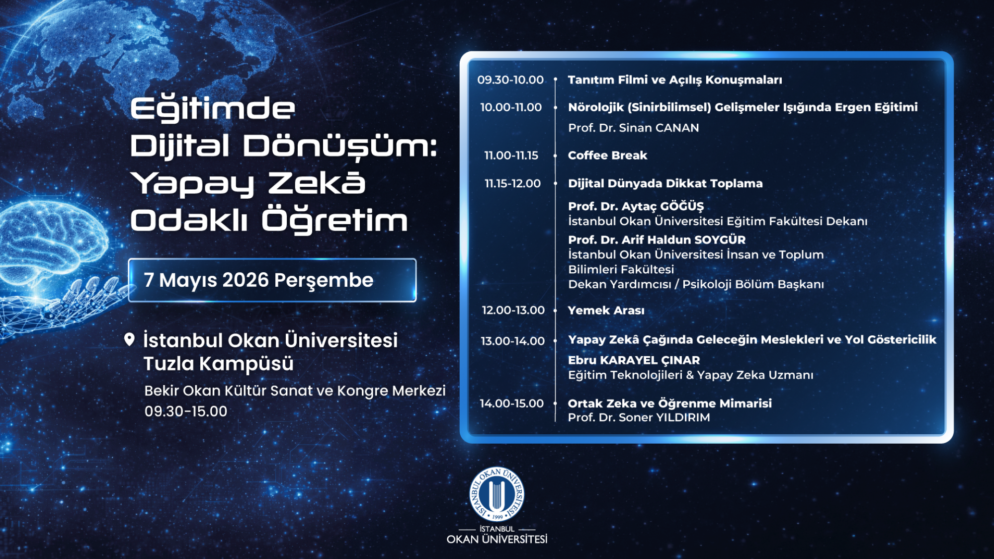 Eğitimde Dijital Dönüşüm: Yapay Zekâ Odaklı Öğretim Konferansı 7 Mayıs 2026 Perşembe günü Tuzla Kampüsümüzde gerçekleştirilecektir.