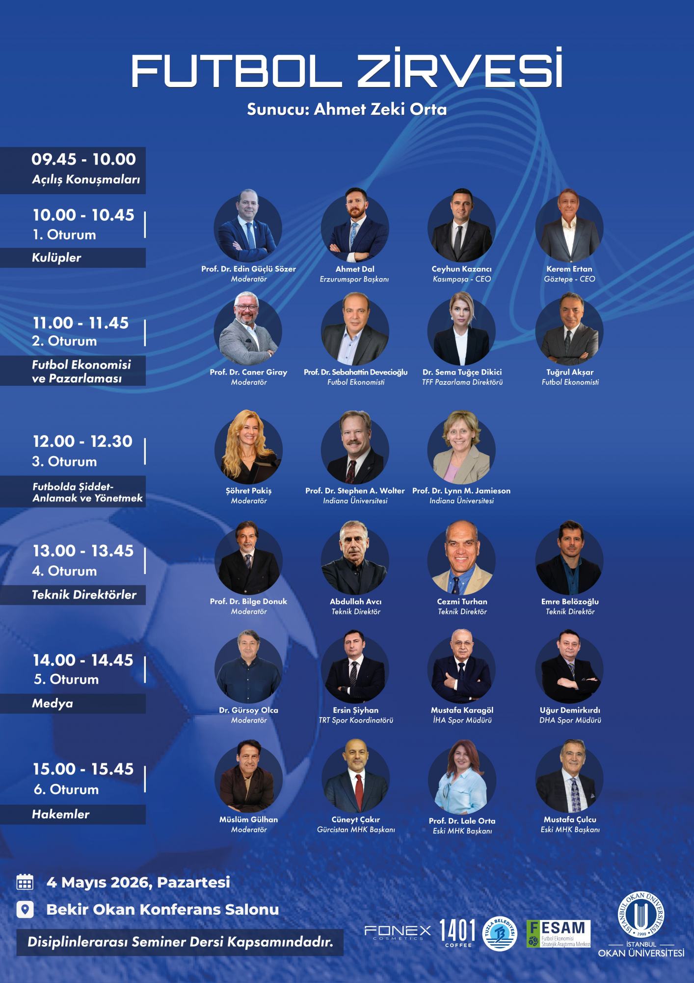 Uygulamalı Bilimler Fakültesi Spor Yöneticiliği Bölümümüzün düzenlediği Futbol Zirvesi, 4 Mayıs 2026 Pazartesi günü Bekir Okan Konferans Salonu’nda. Toplam 6 oturumda 17 konuşmacı, futbolu A’dan Z’ye ele alacak.