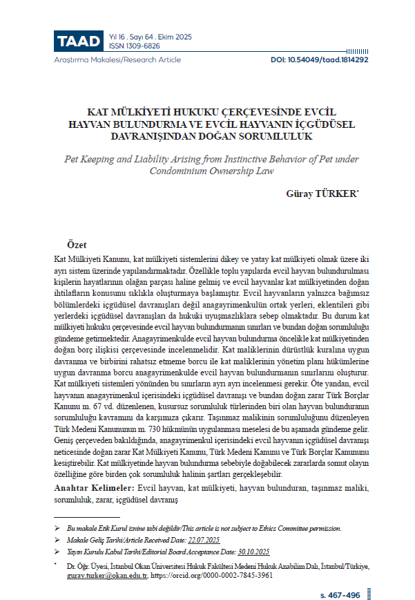 Fakültemiz Medeni Hukuk Anabilim Dalı Öğretim Üyesi Dr. Güray Türker'in "Kat Mülkiyeti Hukuku Çerçevesinde Evcil Hayvan Bulundurma ve Evcil Hayvanın İçgüdüsel Davranışından Doğan Sorumluluk" başlıklı makalesi Türkiye Adalet Akademisi Dergisi'nin Ekim/2025 sayısında yayınlanmıştır.