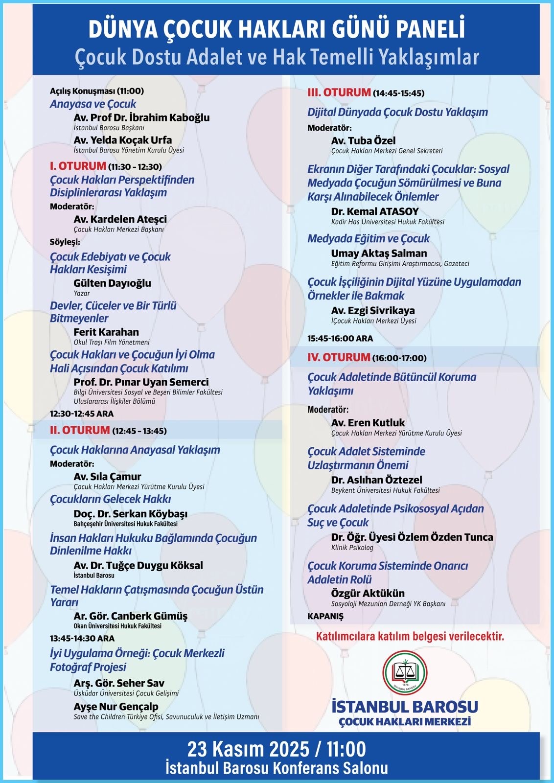 İstanbul Barosu Çocuk Hakları Merkezi tarafından düzenlenen “Dünya Çocuk Hakları Günü Paneli Çocuk Dostu Adalet ve Hak Temelli Yaklaşımlar" başlıklı etkinlikte Fakültemiz Anayasa Hukuku Anabilim Dalı Araştırma Görevlisi Canberk Gümüş de konuşmacı olarak yer alacaktır.