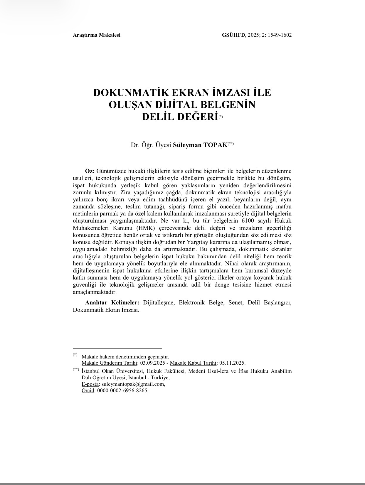 Fakültemiz Medeni Usul-İcra ve İflas Hukuku Öğretim Üyesi Dr. Süleyman TOPAK’ın “Dokunmatik Ekran İmzası ile Oluşan Dijital Belgenin Delil Değeri” başlıklı makalesi, Galatasaray Üniversitesi Hukuk Fakültesi Dergisi’nin 2025/2 sayısında yayınlanmıştır.