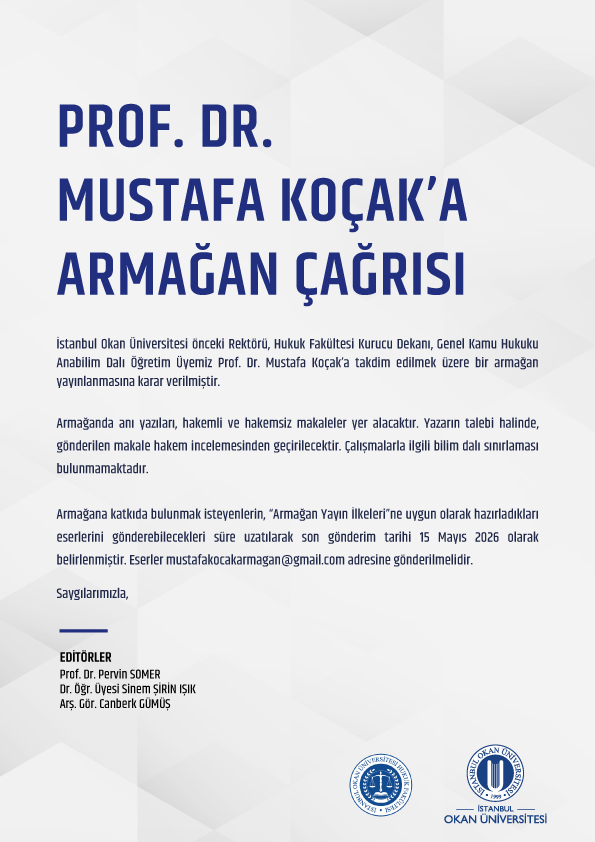 İstanbul Okan Üniversitesi önceki Rektörü, Hukuk Fakültesi Kurucu Dekanı, Genel Kamu Hukuku Anabilim Dalı Öğretim Üyemiz Prof. Dr. Mustafa Koçak’a takdim edilmek üzere bir armağan yayınlanmasına karar verilmiştir.
