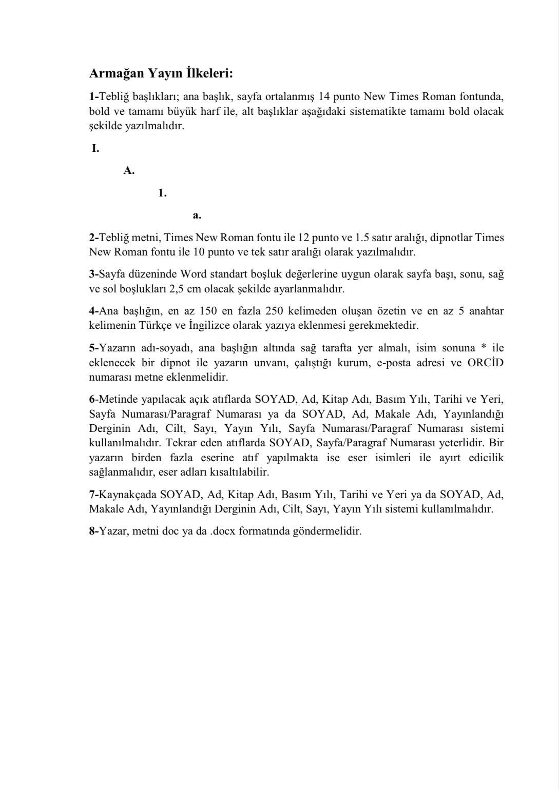 Armağanda anı yazıları, hakemli ve hakemsiz makaleler yer alacaktır. Yazarın talebi halinde, gönderilen makale hakem incelemesinden geçirilecektir. Çalışmalarla ilgili bilim dalı sınırlaması bulunmamaktadır.