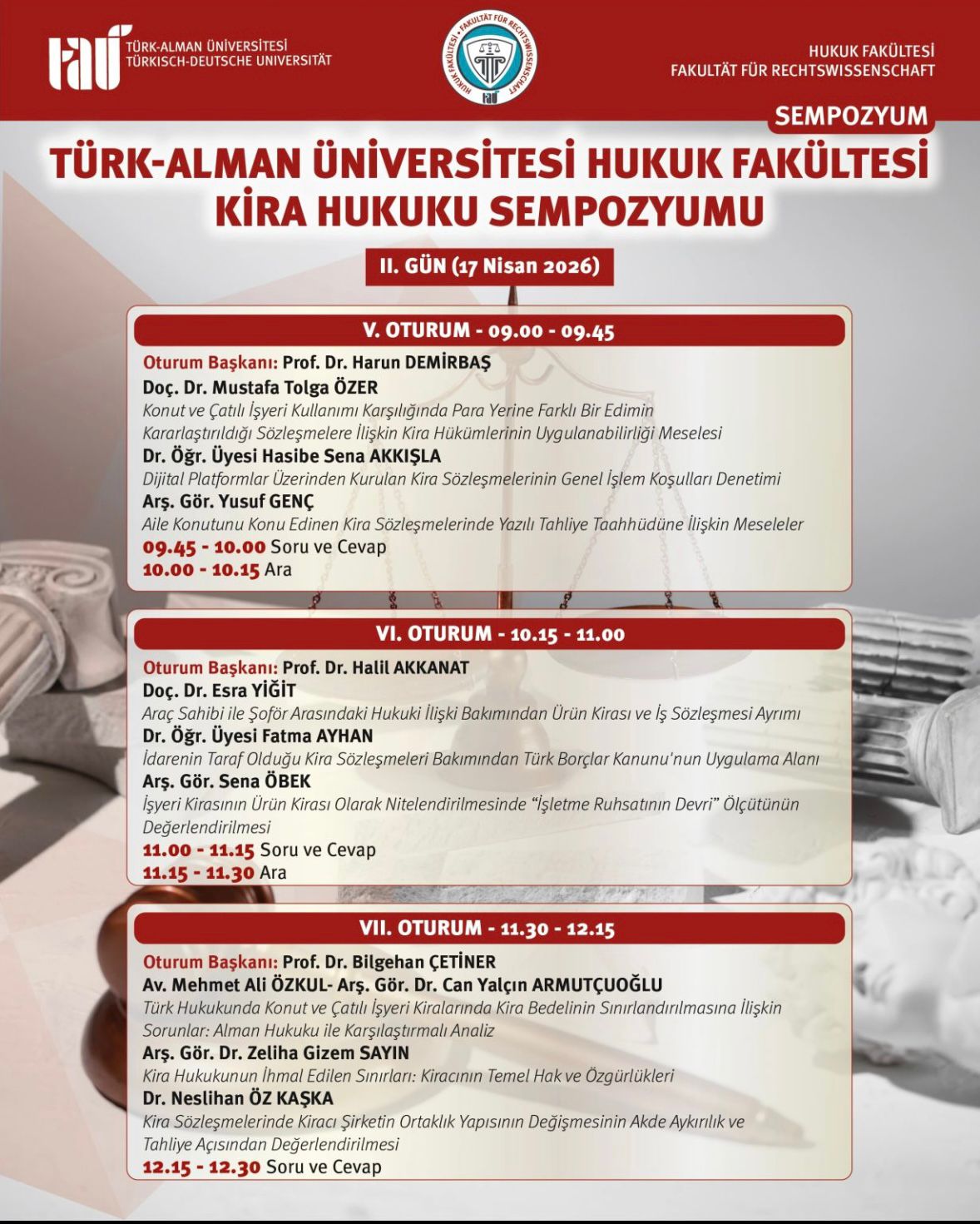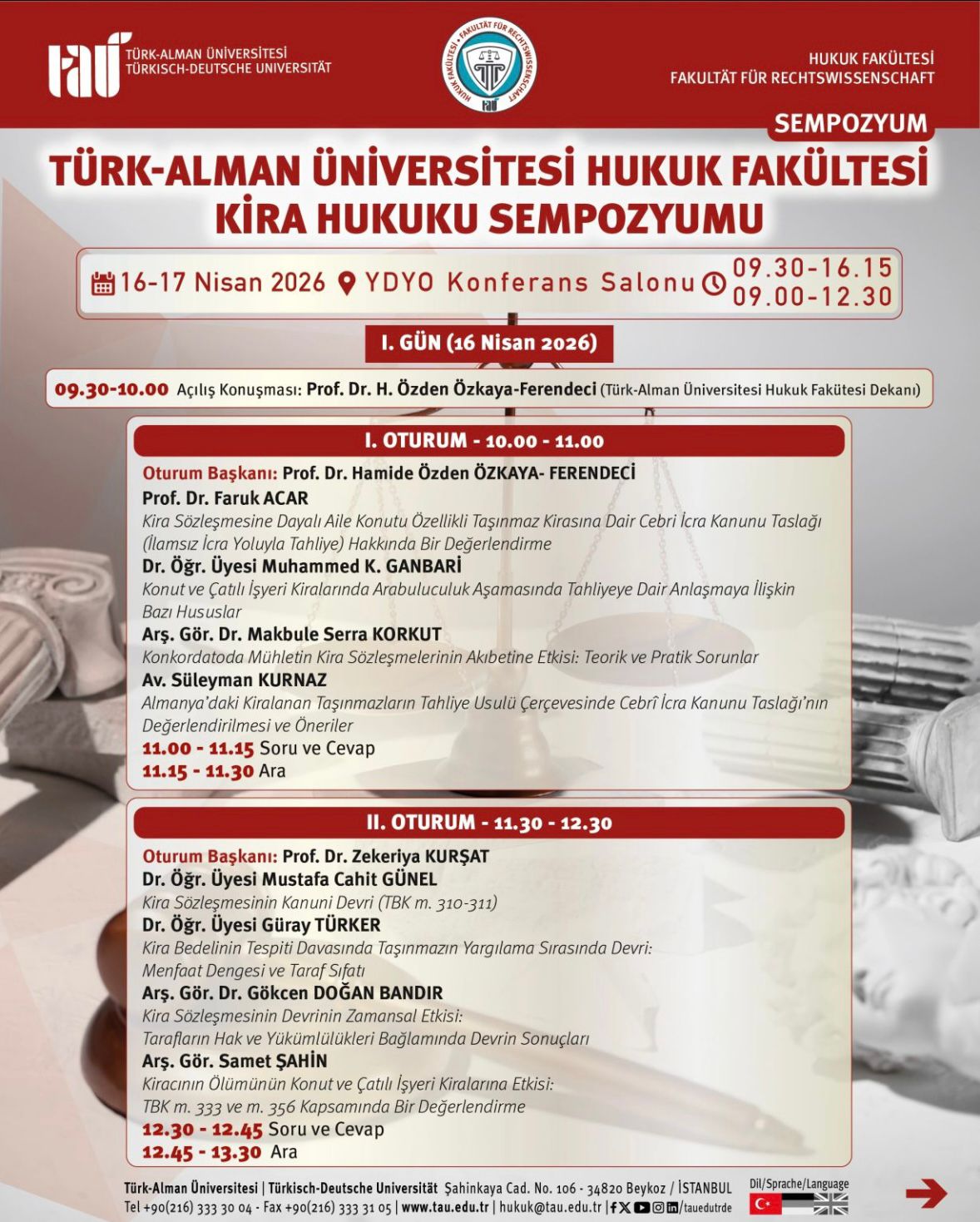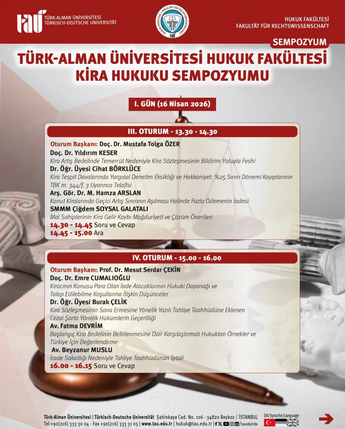 Fakültemiz Medeni Hukuk Anabilim Dalı Öğretim Üyesi Dr. Güray Türker, Türk Alman Üniversitesi Hukuk Fakültesi tarafından 16.04.2026-17.04.2026 tarihlerinde düzenlenecek olan Kira Hukuku Sempozyumu'nda "Kira Bedelinin Tespiti Davasında Taşınmazın Yargılama Sırasında Devri: Menfaat Dengesi ve Taraf Sıfatı" başlıklı bildiriyi sunacaktır.