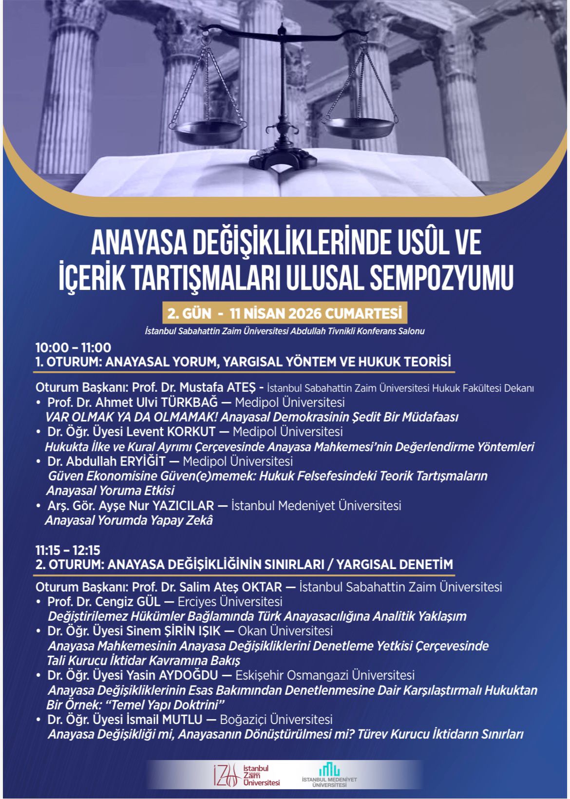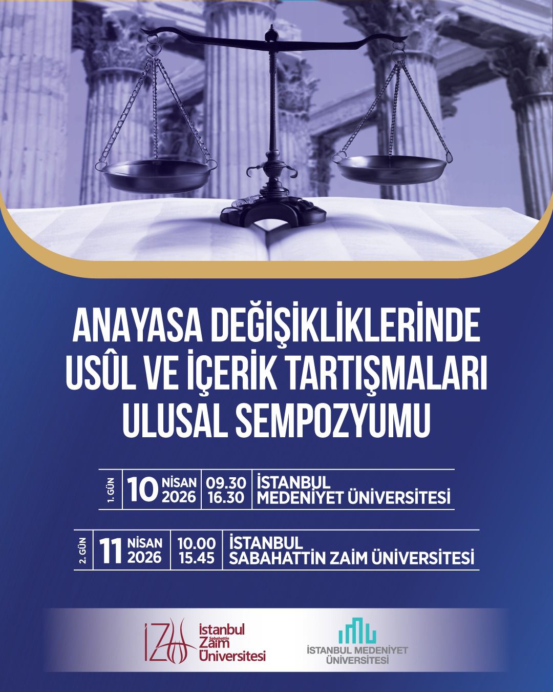 Fakültemiz Anayasa Hukuku Anabilim Dalı Öğretim Üyesi Dr. Sinem Şirin Işık, 10-11 Nisan 2026 cuma-cumartesi günlerinde İstanbul Medeniyet Üniversitesi ve İstanbul Sabahattin Zaim Üniversitesi'nin ortaklaşa düzenlemekte olduğu "Anayasa Değişikliklerinde Usul ve İçerik Tartışmaları Ulusal Sempozyumu"nun ikinci gününde "Anayasa Mahkemesinin Anayasa Değişikliklerini Denetleme Yetkisi Çerçevesinde Tali Kurucu İktidar Kavramına Bakış" başlıklı bir sunum gerçekleştirecektir."