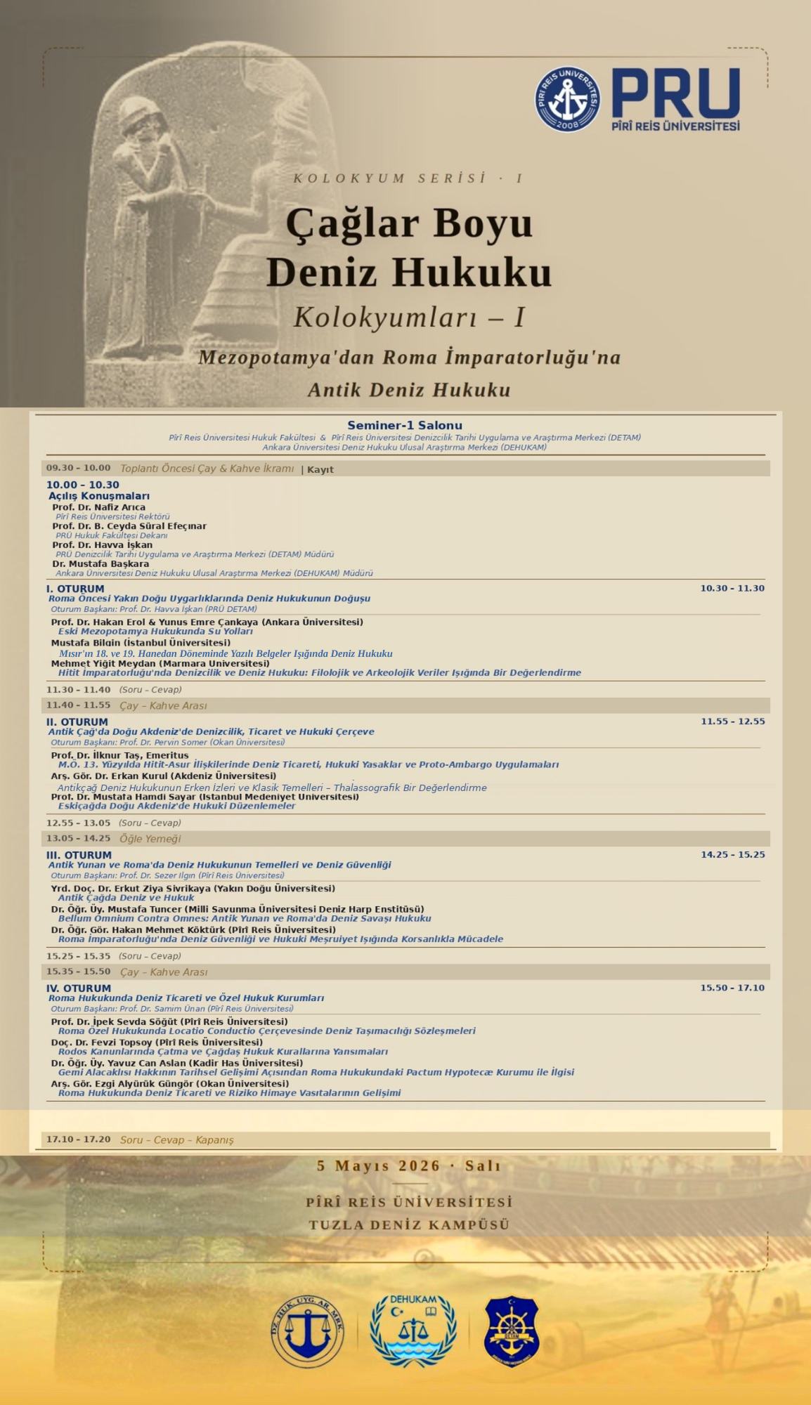 Fakültemiz Roma Hukuku Ana Bilim Dalında görevli Arş. Gör. Ezgi ALYÜRÜK GÜNGÖR, 5 Mayıs 2026 tarihinde Piri Reis Üniversitesi Hukuk Fakültesi, Deniz Hukuku ve Uygulama Araştırma Merkezi ve Denizcilik Tarihi Uygulama ve Araştırma Merkezinin ortaklaşa düzenlemekte olduğu "Çağlar Boyu Deniz Hukuku Kolokyumları-1 Mezopotamya'dan Roma İmparatorluğu'na Antik Deniz Hukuku" başlıklı kolokyumda "Roma Hukukunda Deniz Ticareti Ve Riziko Himaye Vasıtalarının Gelişimi" başlıklı tebliği sunacaktır.