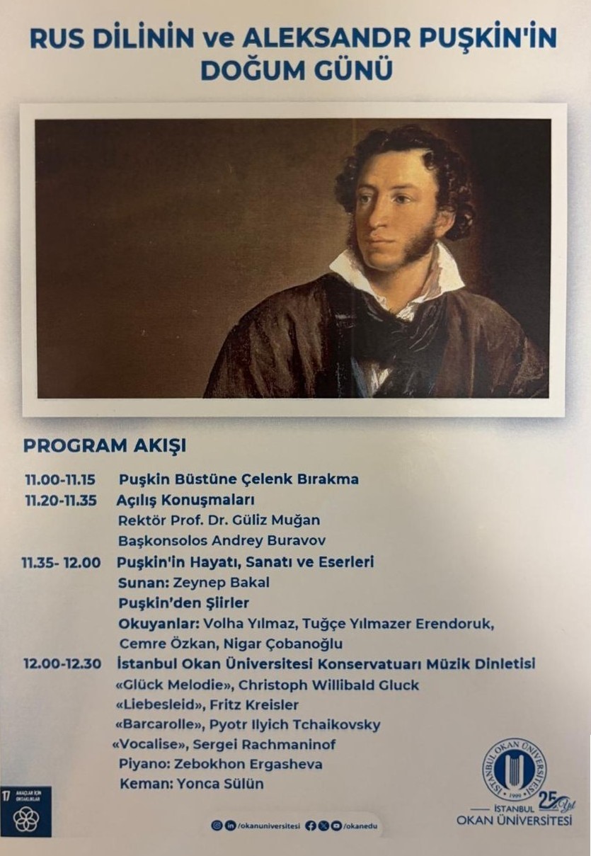 Aleksandr Sergeyeviç Puşkin’in 6 Haziran’daki doğum günü Rusya’da çok önem atfedilen bir gün olup aynı zamanda Rus Dilinin de doğum günü olarak kutlanmaktadır. Üniversitemiz bünyesinde de, bu önemli gün ülkemizde tek olan Puşkin büstüne çelenkler konulup saygılar sunulması ile kutlanmaya başlanmıştır.