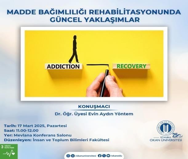 Etkinlik Açıklaması: Bu etkinlikte, bağımlılık alanında son yıllarda geliştirilen bilimsel, psikolojik ve terapötik müdahale yöntemleri ele alınmıştır. Madde kullanım bozukluklarının birey, aile ve toplum üzerindeki etkileri çerçevesinde, etkili rehabilitasyon süreçlerinin nasıl yapılandırılması gerektiği disiplinlerarası bir perspektifle tartışılmıştır. Etkinlik kapsamında; Dr. Öğr. Üyesi Evin Aydin Yöntem, bilişsel davranışçı terapi, motivasyonel görüşme, travma odaklı yaklaşımlar, grup terapileri ve nörobilim temelli uygulamalar gibi güncel yöntemleri paylaşmış ve vaka örnekleri üzerinden değerlendirmelerde bulunmuştur.