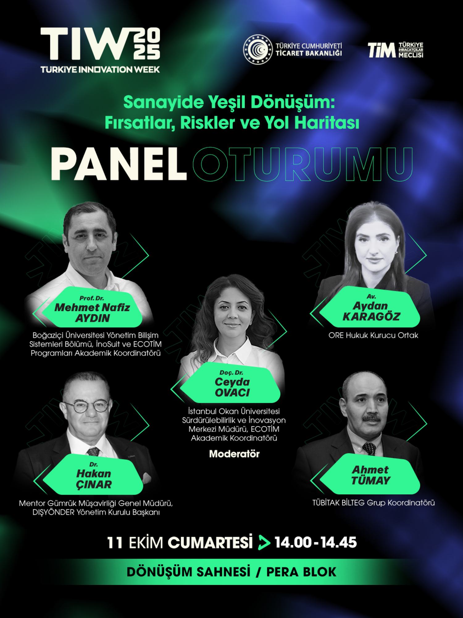 11 Ekim 2025 Cumartesi günü, saat 14.00-14.45 arasında “InnovaZone Dönüşüm Sahnesi”nde, Üniversitemiz Sürdürülebilirlik ve İnovasyon Merkez Müdürü, ECOTİM Akademik Koordinatörü Doç. Dr. Ceyda Ovacı moderatörlüğünde “Sanayide Yeşil Dönüşüm: Fırsatlar, Riskler ve Yol Haritası” panel oturumu gerçekleşecektir.