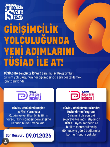 “TÜSİAD Bu Gençlikte İŞ Var!” girişimcilik programlarının 2025 - 2026 dönemi başvuruları başladı. 15 yıldır genç girişimcilere ilham veren “TÜSİAD Bu Gençlikte İŞ Var!”, bu yıl da iş dünyasının bilgi ve deneyimini gençlerin yenilikçi fikirleriyle buluşturmaya devam ediyor.