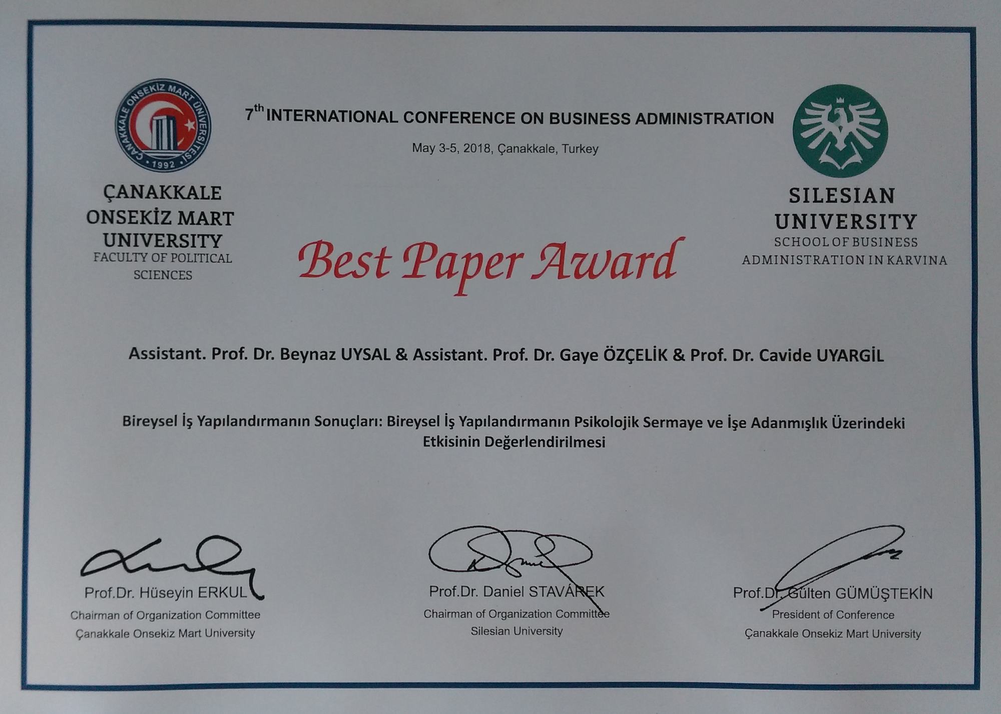 Dr. Öğr. Üyesi Beynaz Uysal’ın Çanakkale 18 Mart Üniversitesi ve Silesian Üniversitesi işbirliğiyle düzenlenen 7. Uluslararası Yönetim Bilimleri Kongresi'ne başvurusunu yaptığı "Bireysel İş Yapılandırmanın Sonuçları: Bireysel İş Yapılandırmanın Psikolojik Sermaye ve İşe Adanmışlık Üzerindeki Etkisinin Değerlendirilmesi" isimli bildirisi, kongrede En İyi Bildiri Ödülü'nü (Best Paper Award) almıştır. İlgili çalışma Prof. Dr. Cavide Uyargil (İstanbul Üniversitesi) ve Doç. Dr. Gaye Özçelik (İstanbul Bilgi Üniversitesi) ile birlikte gerçekleştirilmiştir.