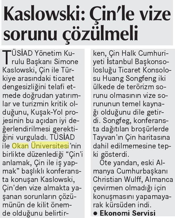 Cumhuriyet – “Kaslowski: Çin’le Vize Sorunu Çözülmeli”