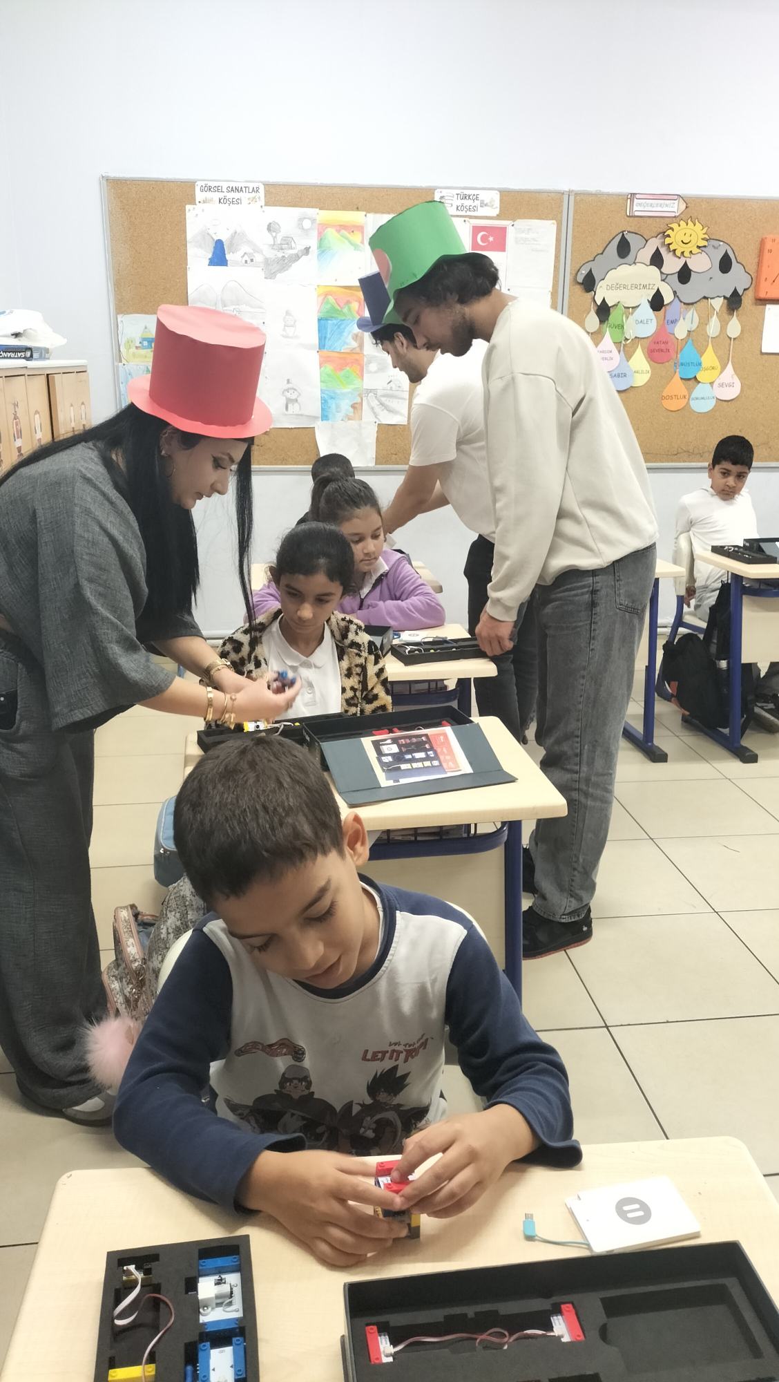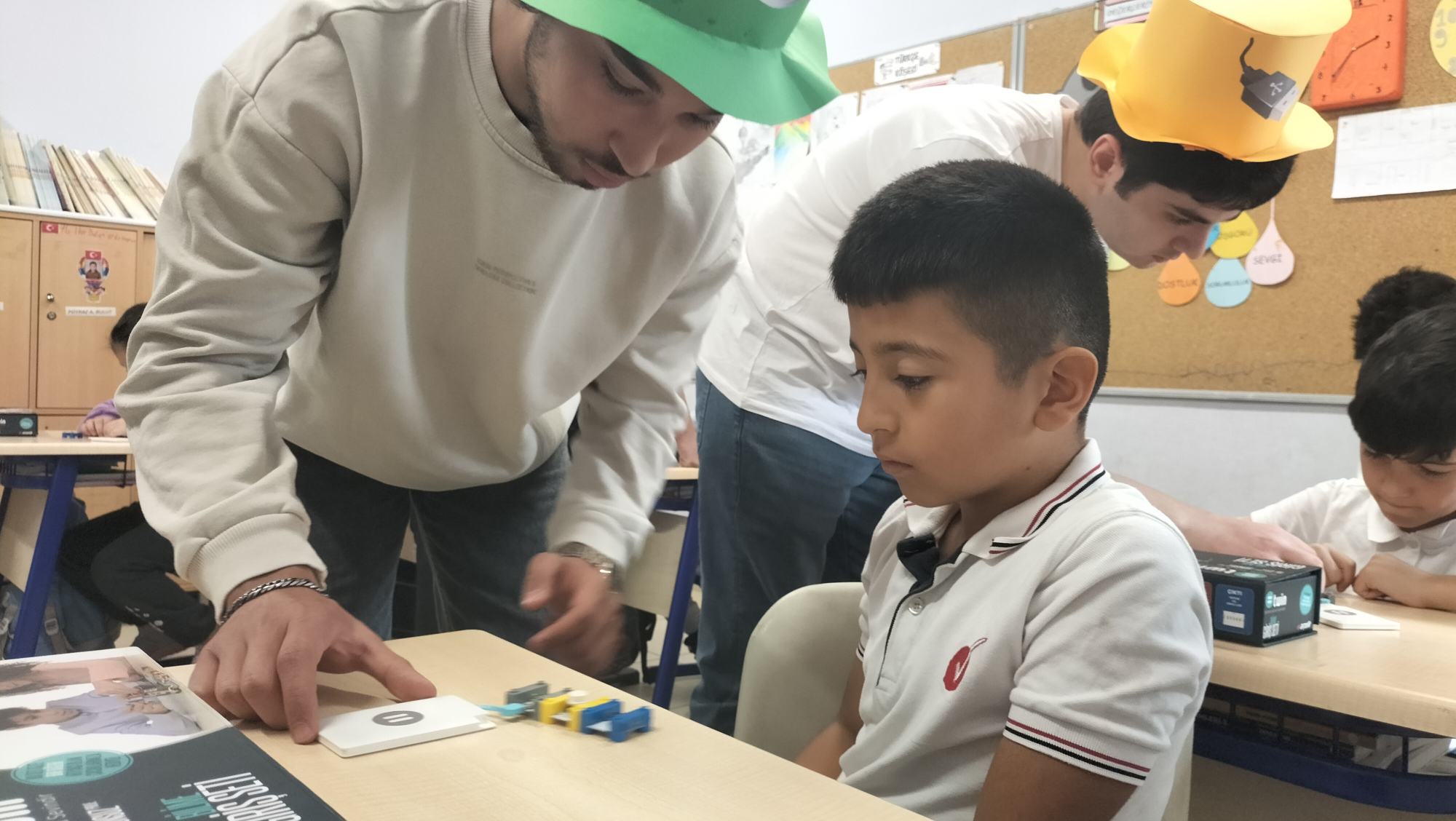 Tanıtımdan sonra başlayan atölye çalışmasında ise heyecan doruktaydı. Üniversite öğrencilerimiz, ilkokul öğrencilerine birebir mentörlük yaparak her birinin kendi basit elektrik devresini kurmasına ve kendi kornasını yapmasına yardımcı oldu. Kendi yaptıkları kornaları çalıştırmayı başaran minik öğrencilerin sevinci ve öğrenme hevesi görülmeye değerdi.