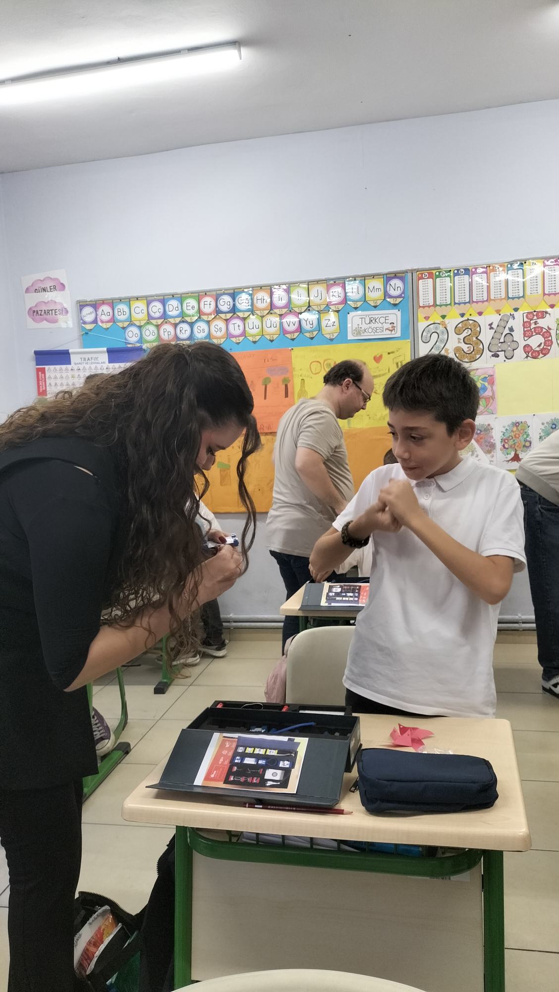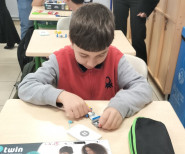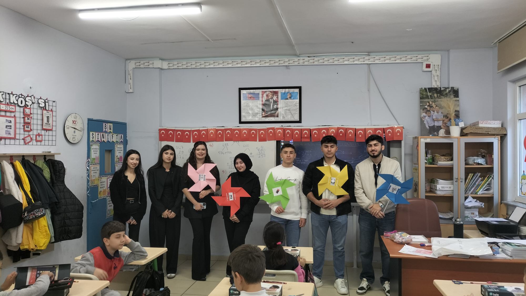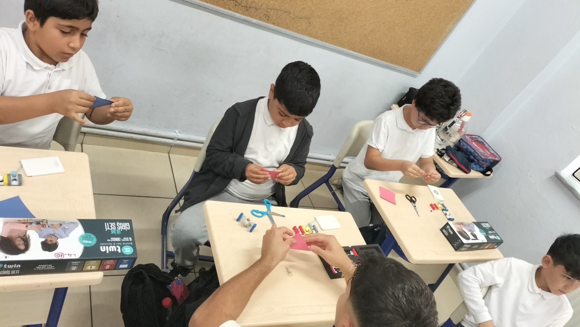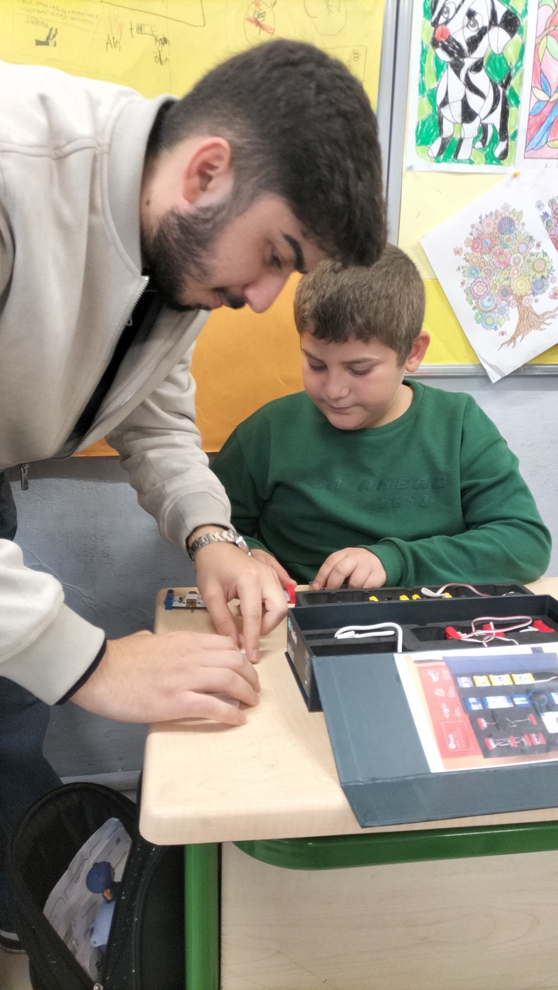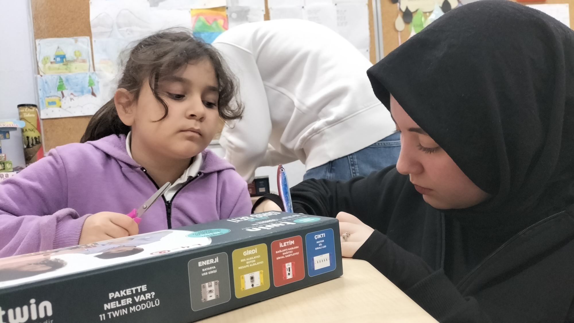 Tanıtımdan sonra başlayan atölye çalışmasında heyecan yine doruktaydı. Öğrencilerimiz, ilkokul öğrencilerine birebir mentörlük yaparak her birinin kendi basit motor devresini kurmasına ve kendi vantilatörünü yapmasına yardımcı oldu. Kendi kâğıttan yaptıkları vantilatörlerin pervanelerinin döndüğünü gören minik öğrencilerin sevinci ve öğrenme hevesi görülmeye değerdi.