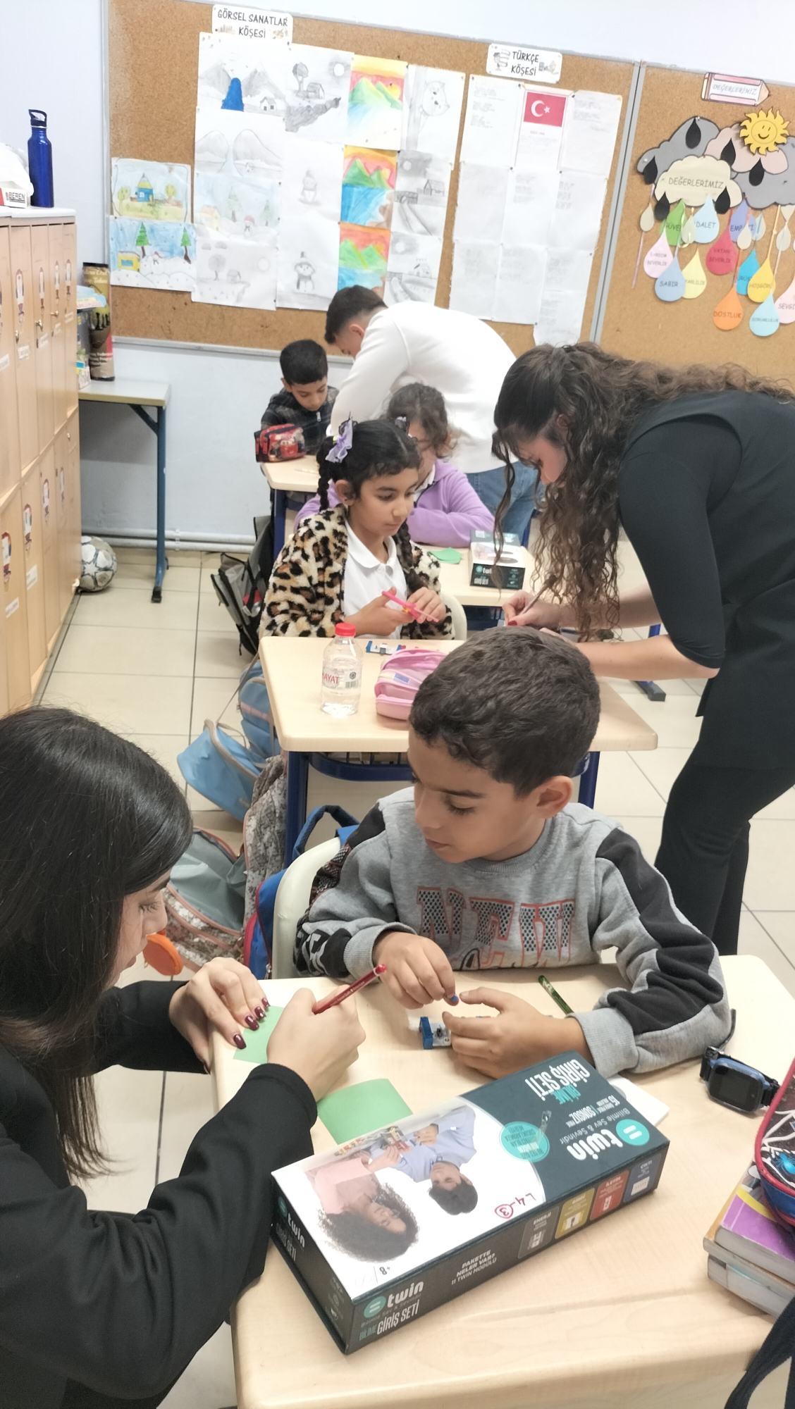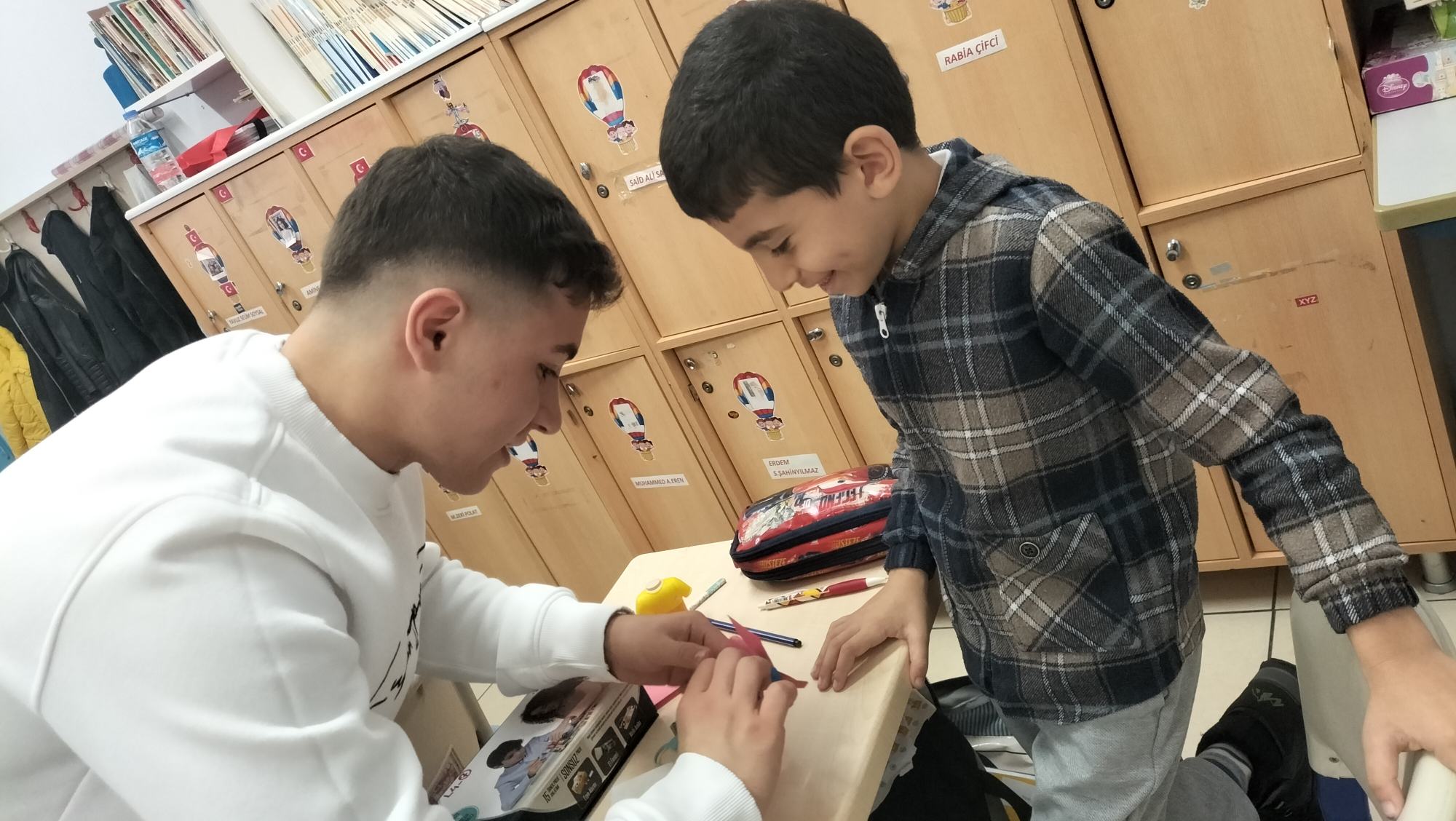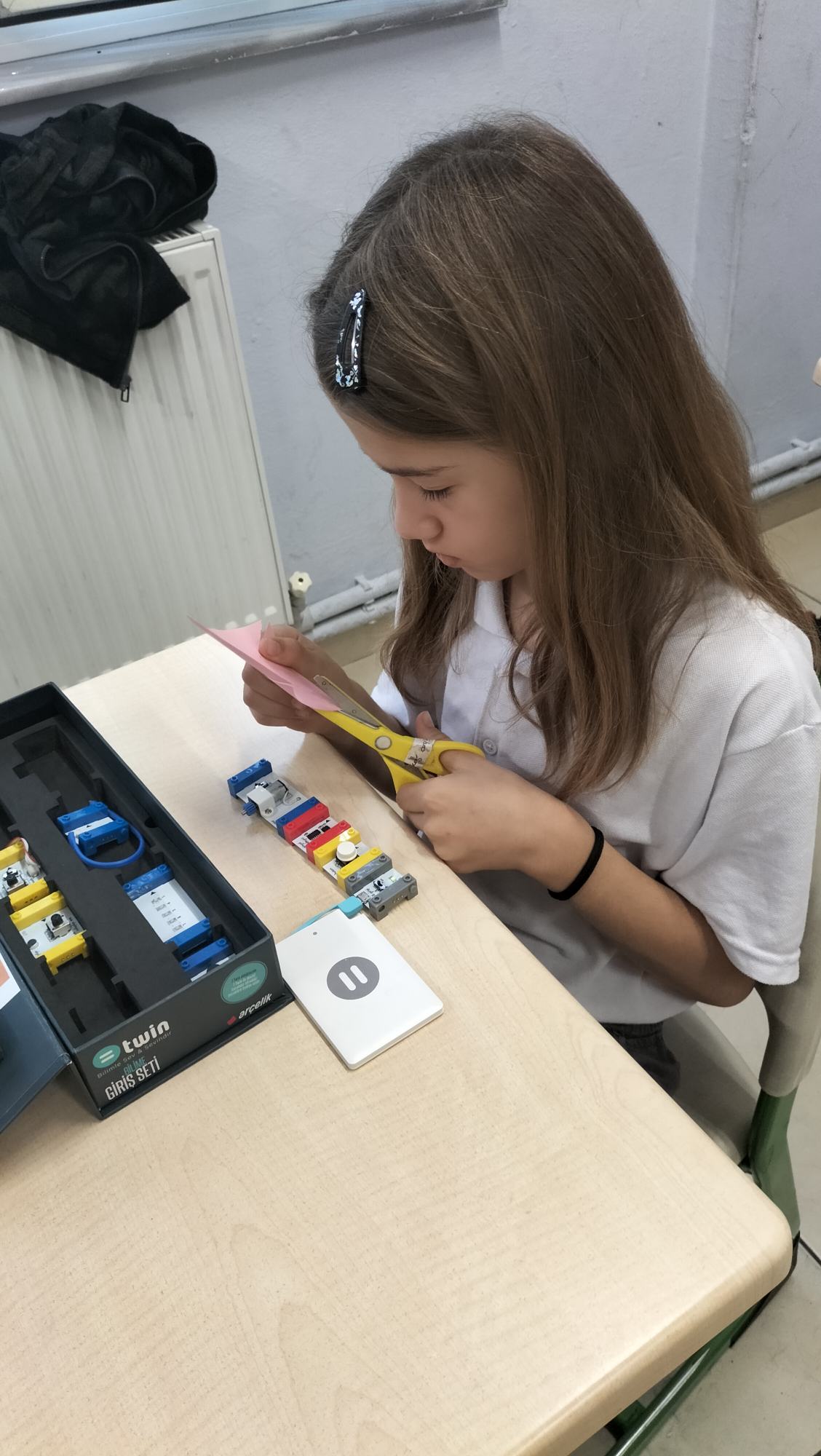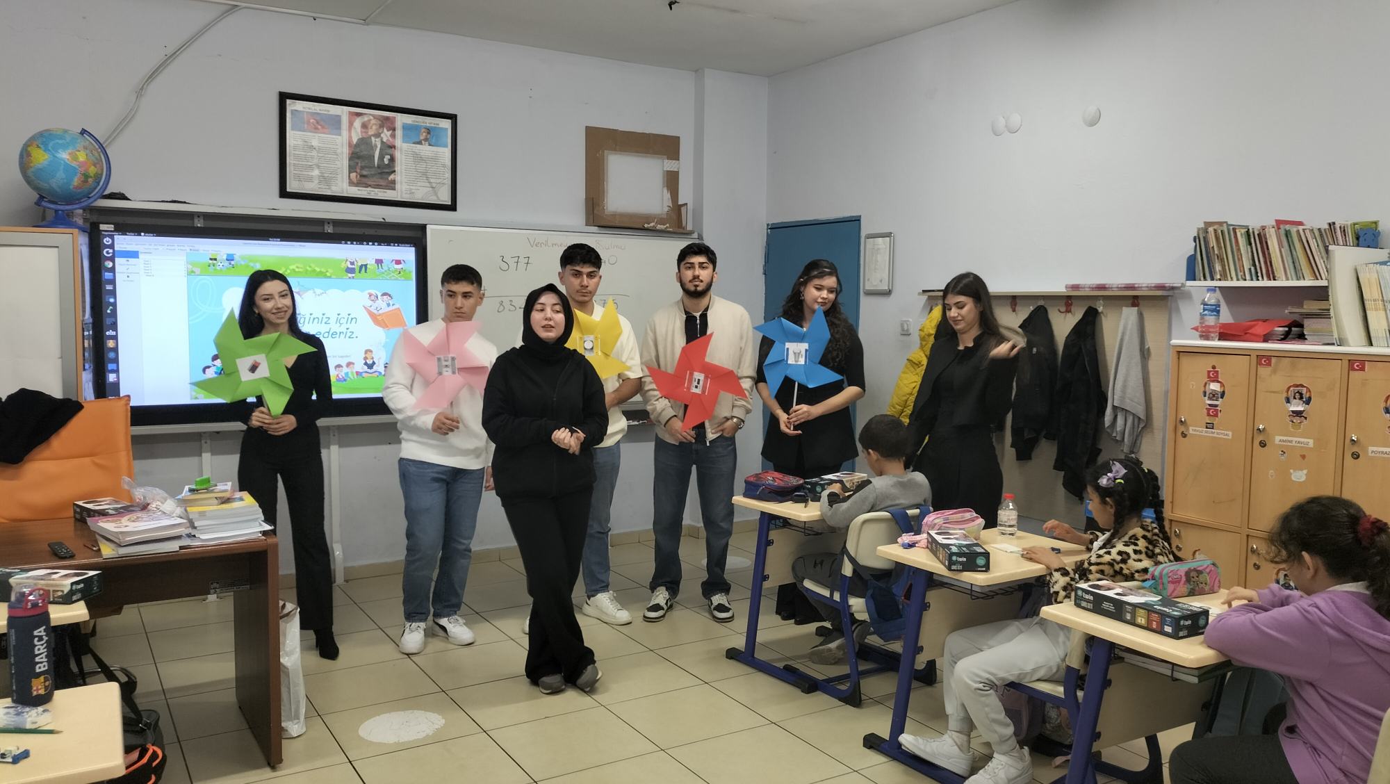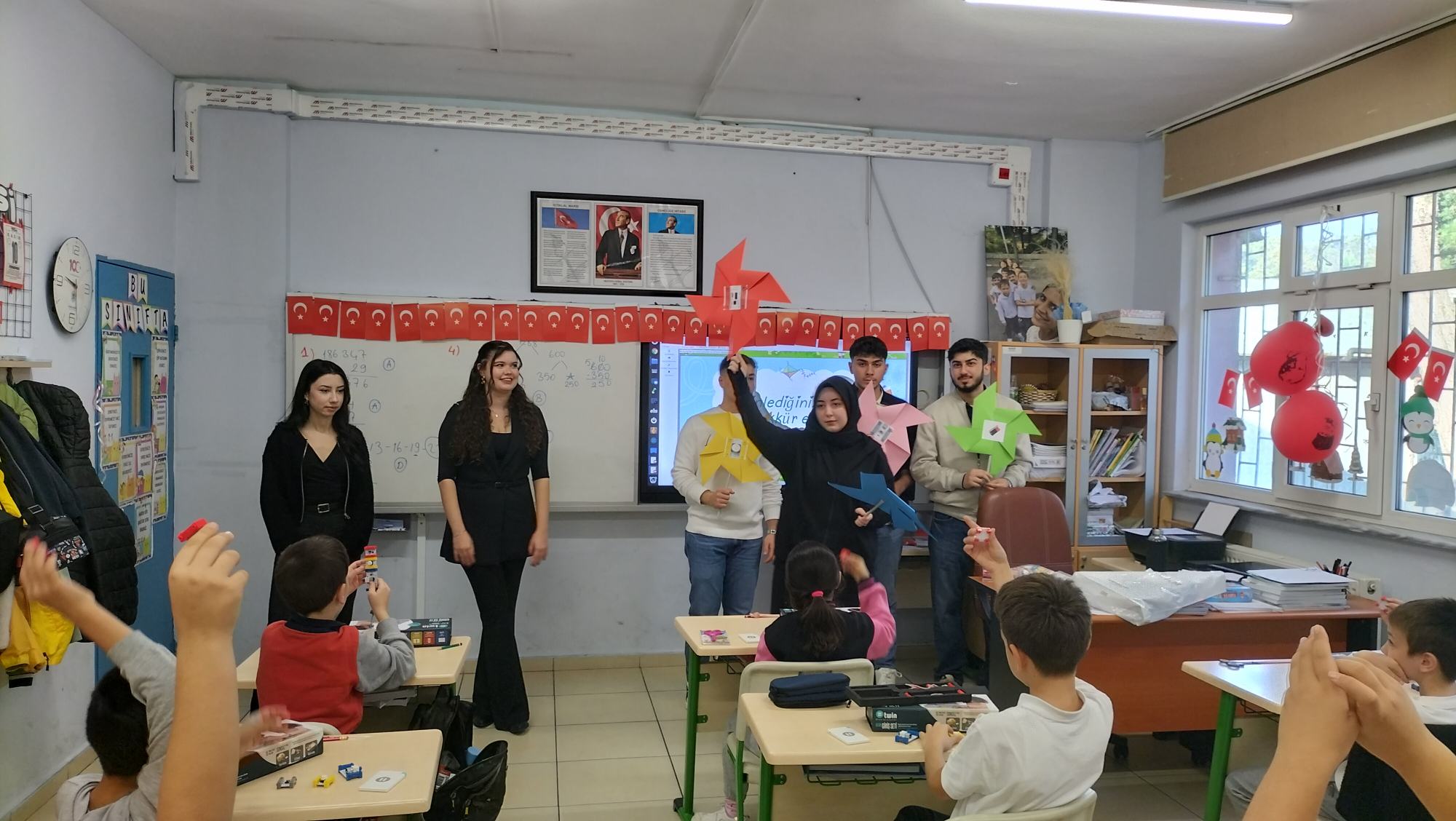 Tanıtımdan sonra başlayan atölye çalışmasında heyecan yine doruktaydı. Öğrencilerimiz, ilkokul öğrencilerine birebir mentörlük yaparak her birinin kendi basit motor devresini kurmasına ve kendi vantilatörünü yapmasına yardımcı oldu. Kendi kâğıttan yaptıkları vantilatörlerin pervanelerinin döndüğünü gören minik öğrencilerin sevinci ve öğrenme hevesi görülmeye değerdi.