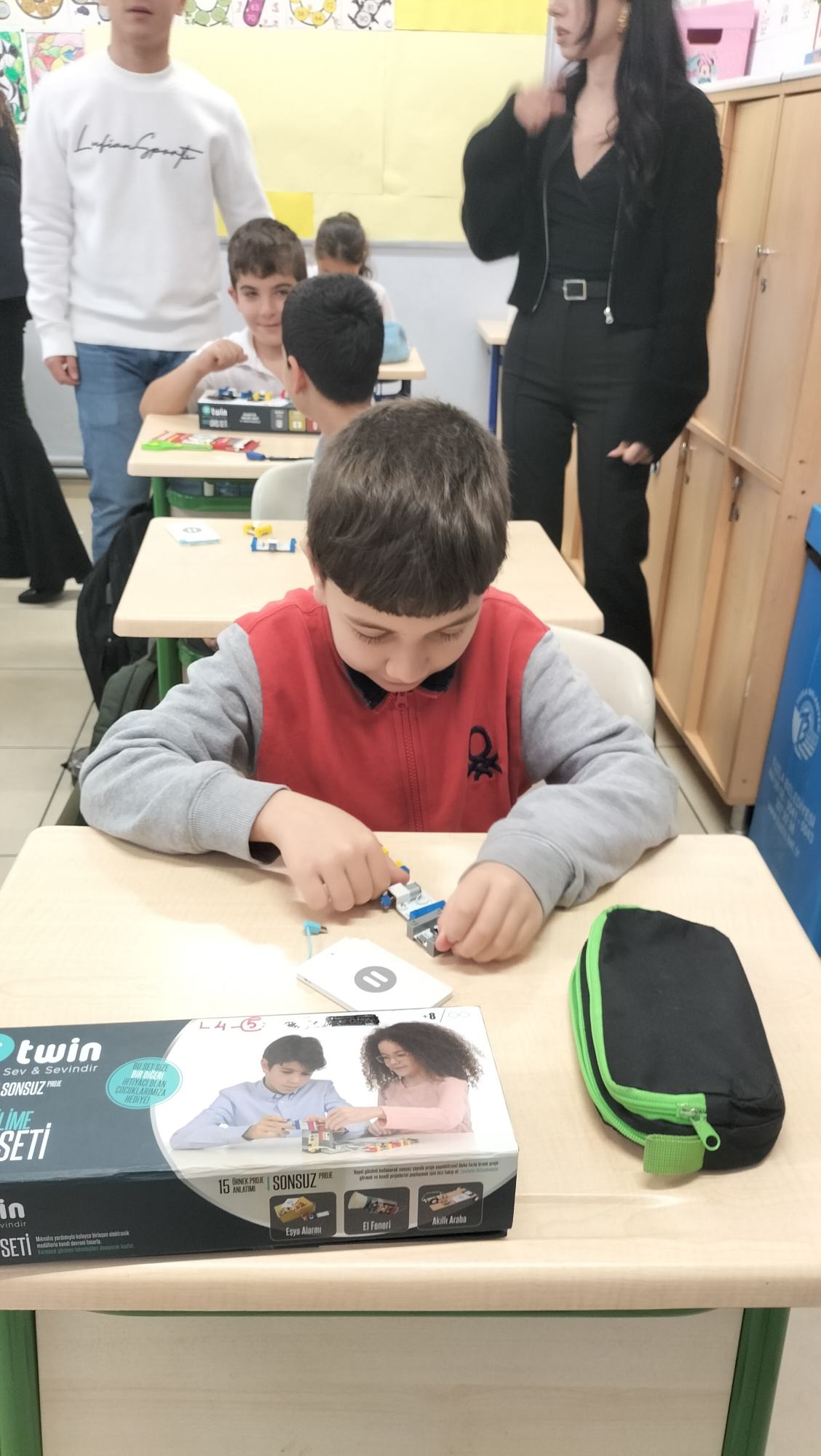 Etkinliğin açılış dersini veren Öğretim Görevlimiz Alper Çeltikçi, ilk ziyarette öğrenilen basit elektrik devresi bilgilerini pekiştirerek minik öğrencilere "twin eğitim seti" materyallerinin yeni bir modülünü tanıttı. Öğrencilere basit bir motorun nasıl çalıştığını ve bu motoru kullanarak nasıl vantilatör yapacaklarını anlatarak, öğrencilerin meraklı sorularını yanıtladı.