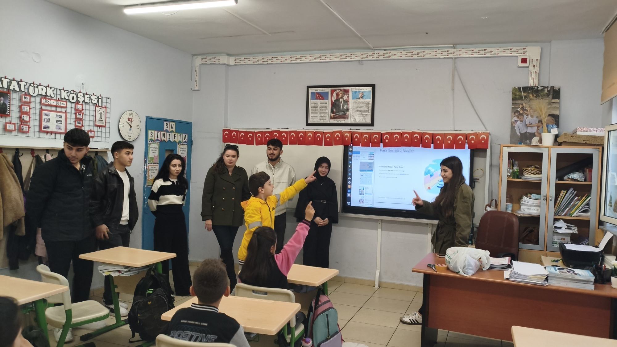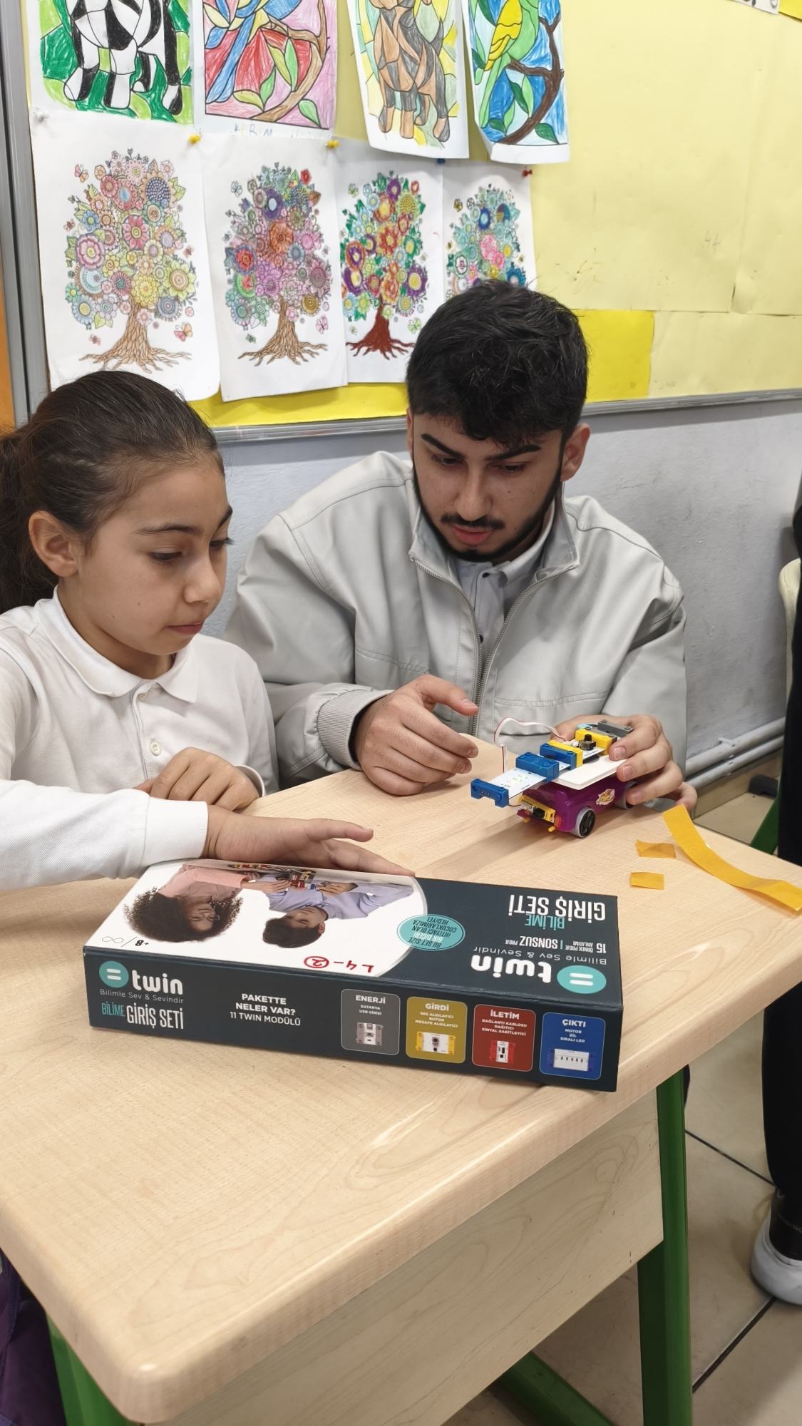 Bu ilham verici giriş dersinin ardından sahneyi öğrencilerimiz devraldı. Öğrencilerimiz, ilkokul öğrencisi kardeşlerine günlük hayatta sıkça karşılaştıkları araç teknolojilerinden biri olan "Park Sensörü Yapımı"nı uygulamalı olarak gösterdi.
