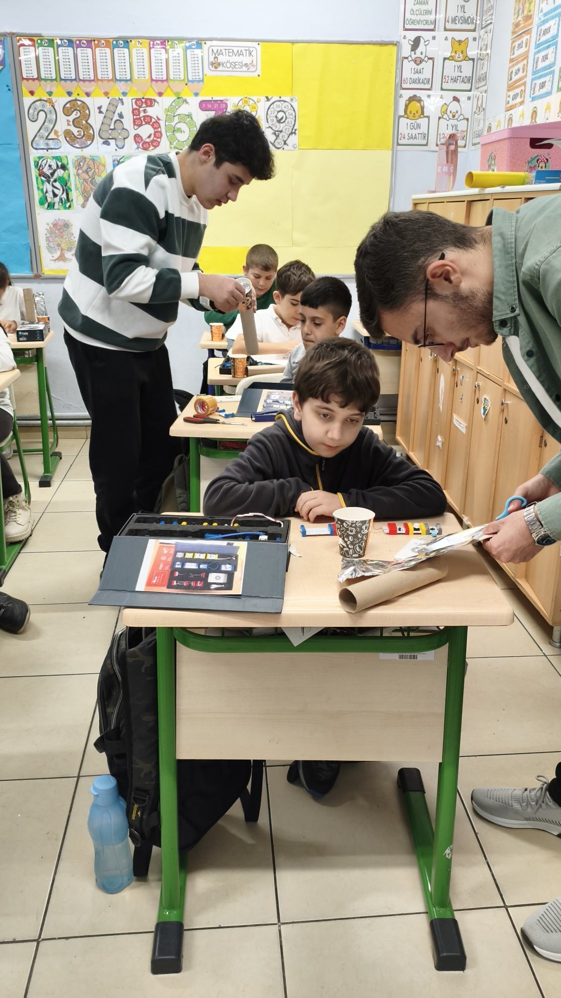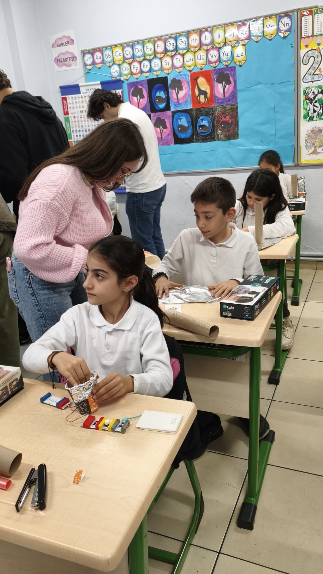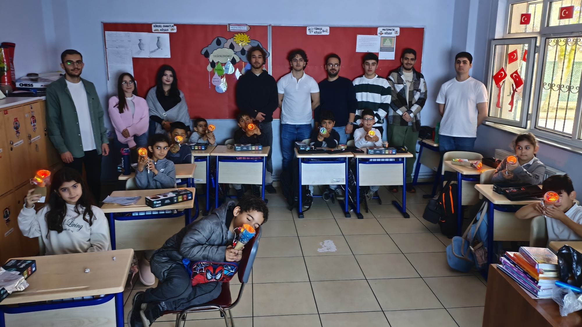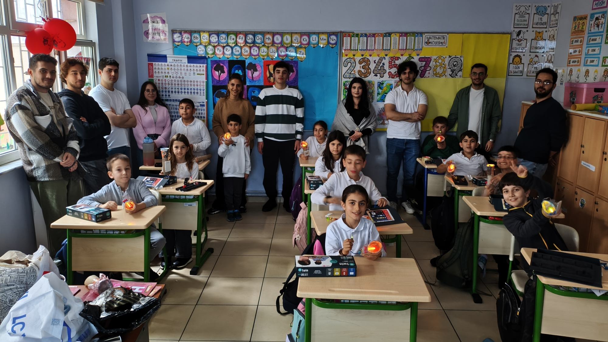 Dersin ardından sahneyi öğrencilerimiz devraldı. Öğrencilerimiz, ilkokul öğrencisi kardeşlerine devre elemanlarını birleştirerek basit bir el fenerinin nasıl yapılacağını uygulamalı olarak gösterdi. Batarya, buton ve sıralı LED modüllerini bağlantı kabloları ile birleştiren minik eller, devrelerini tamamladıklarında kendi ışıklarını yakmanın mutluluğunu yaşadı.