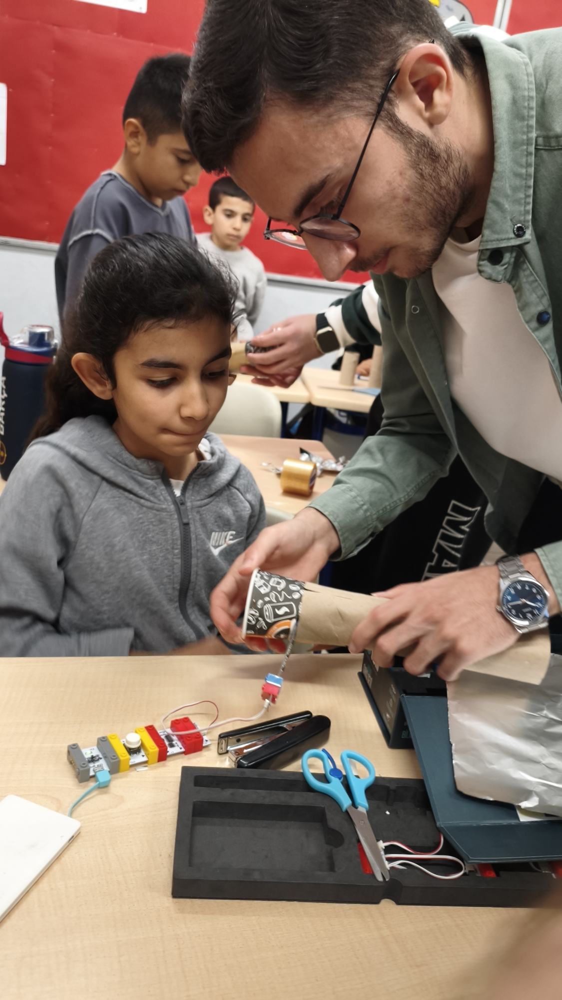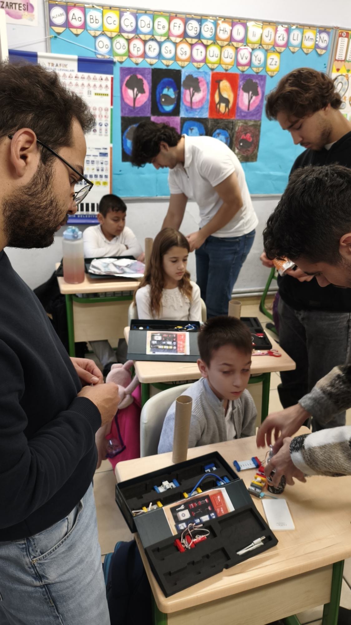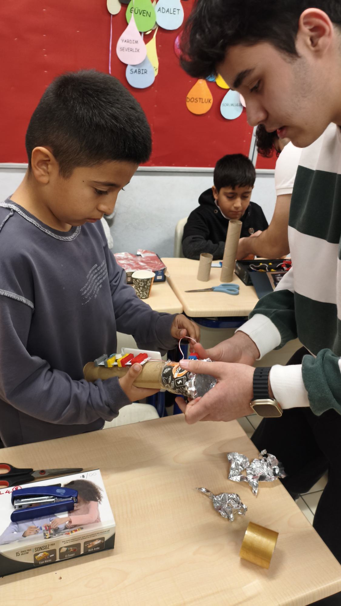 Dersin ardından sahneyi öğrencilerimiz devraldı. Öğrencilerimiz, ilkokul öğrencisi kardeşlerine devre elemanlarını birleştirerek basit bir el fenerinin nasıl yapılacağını uygulamalı olarak gösterdi. Batarya, buton ve sıralı LED modüllerini bağlantı kabloları ile birleştiren minik eller, devrelerini tamamladıklarında kendi ışıklarını yakmanın mutluluğunu yaşadı.