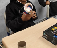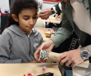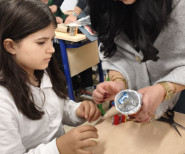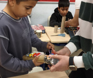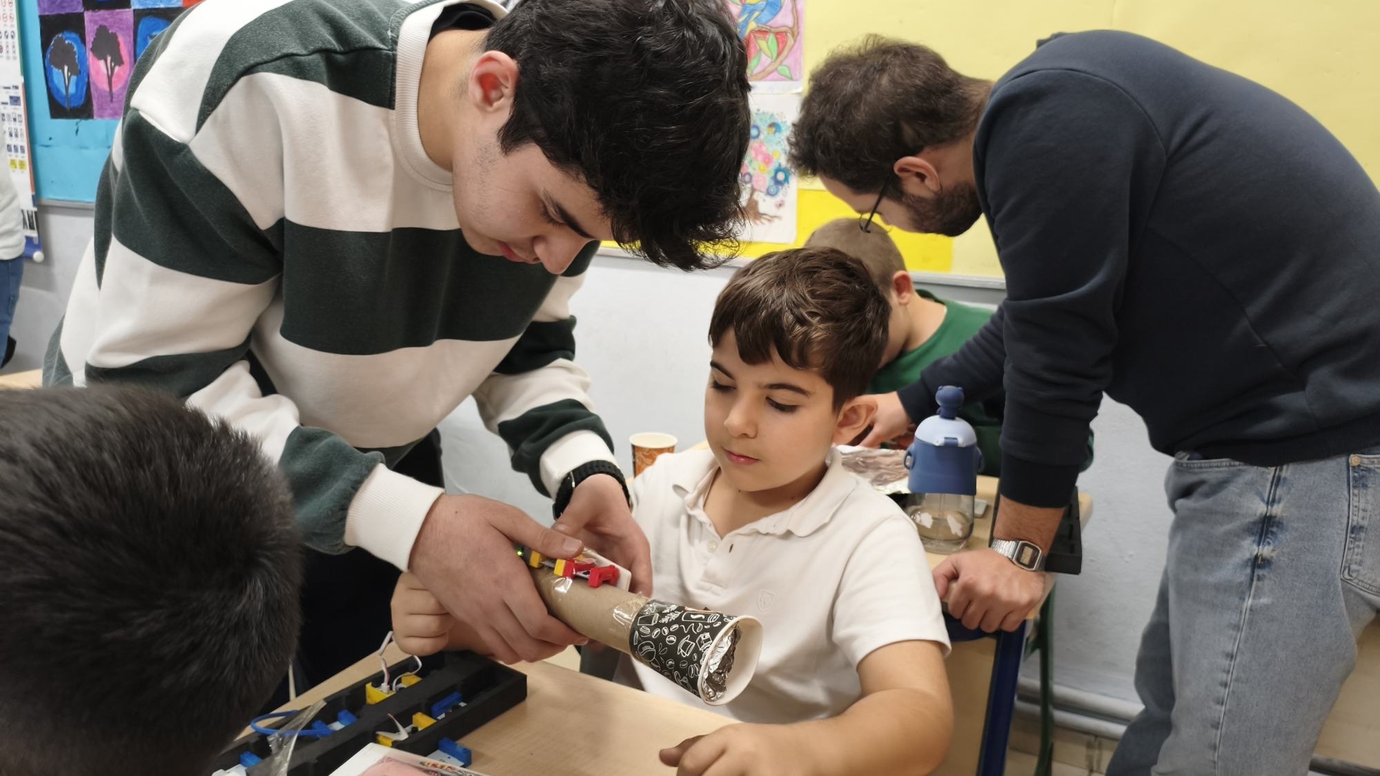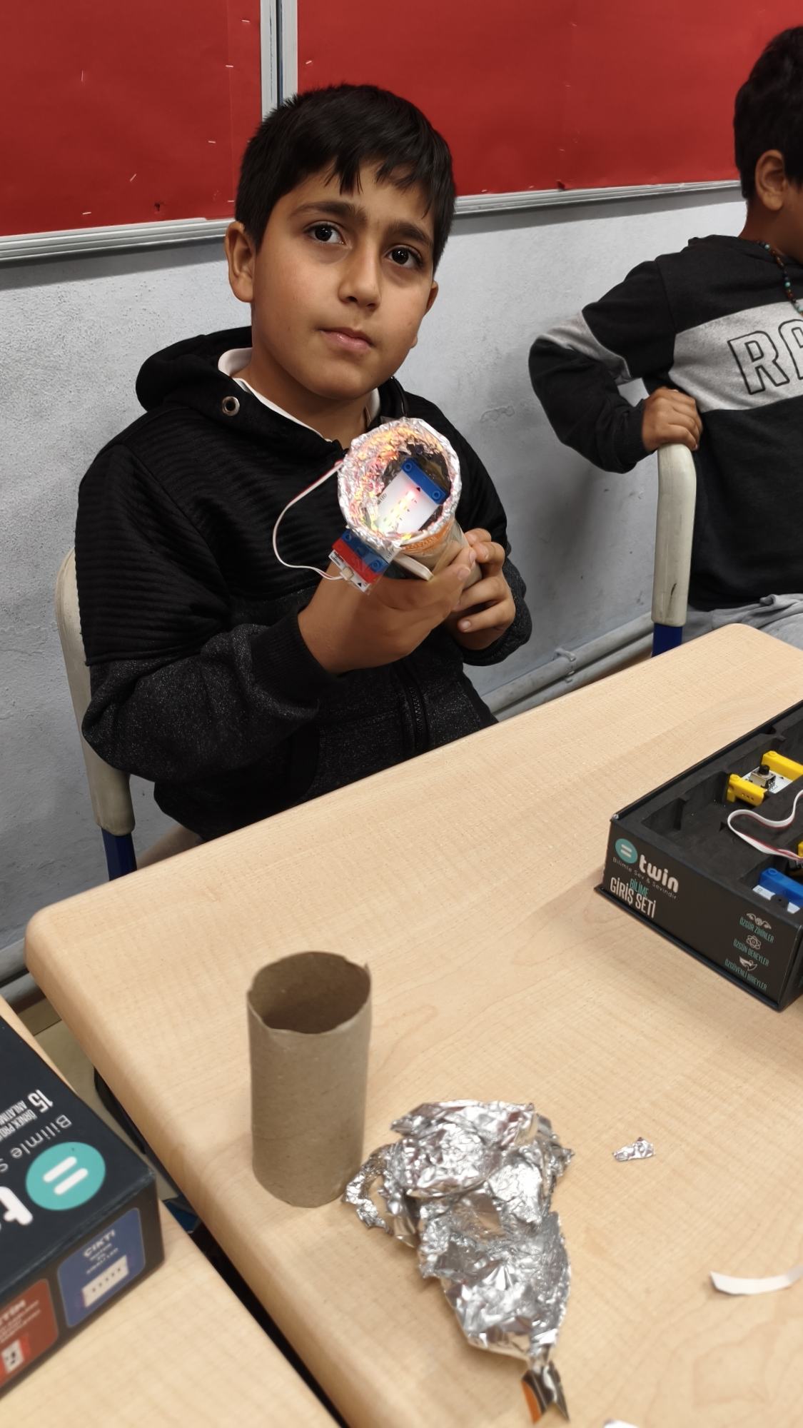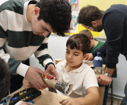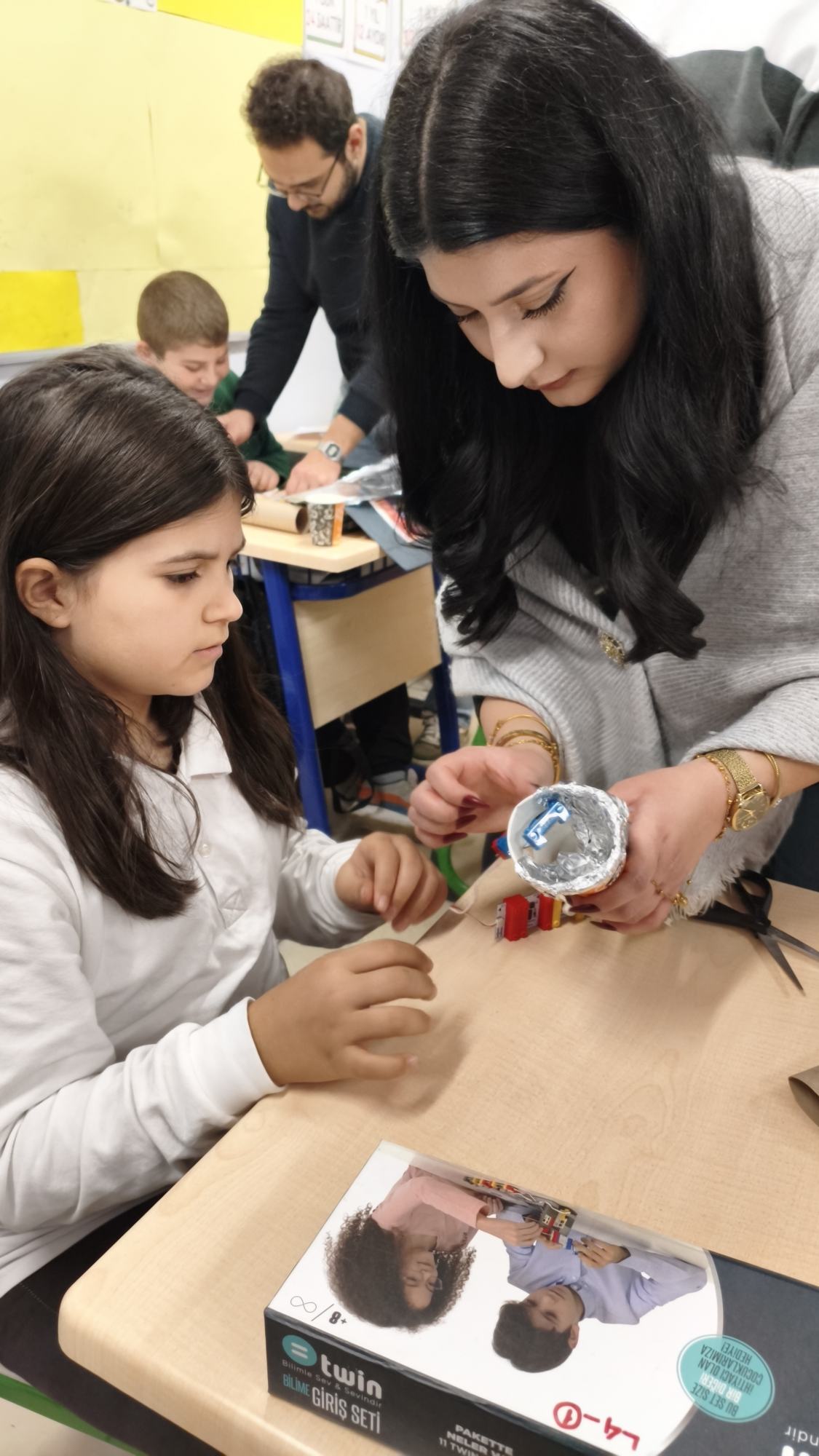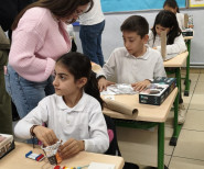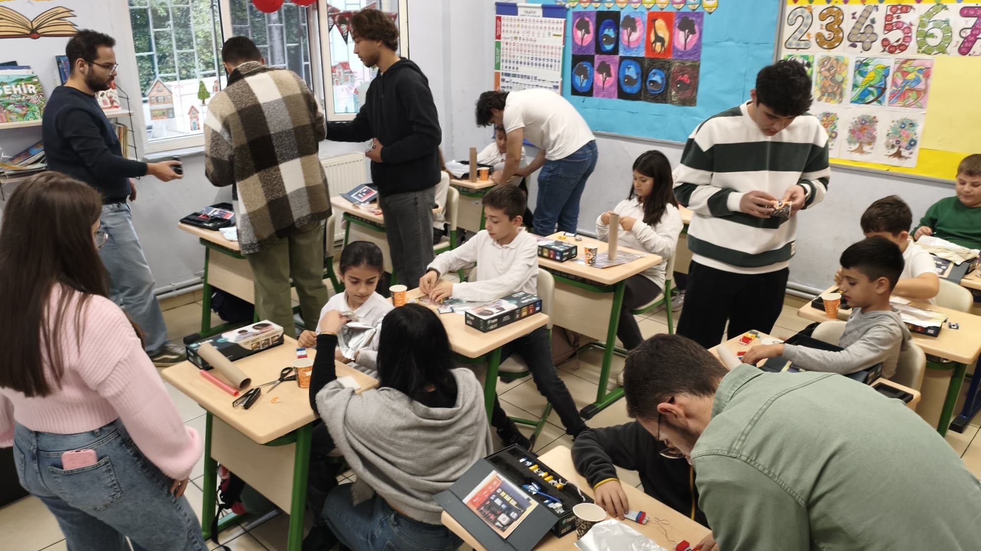 Dersin ardından sahneyi öğrencilerimiz devraldı. Öğrencilerimiz, ilkokul öğrencisi kardeşlerine devre elemanlarını birleştirerek basit bir el fenerinin nasıl yapılacağını uygulamalı olarak gösterdi. Batarya, buton ve sıralı LED modüllerini bağlantı kabloları ile birleştiren minik eller, devrelerini tamamladıklarında kendi ışıklarını yakmanın mutluluğunu yaşadı.