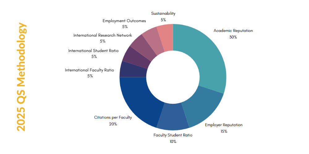 QS World University Rankings kapsamında üniversiteler; akademik itibar, işveren itibarı, öğretim üyesi/öğrenci oranı, atıf başına öğretim üyesi, uluslararası öğretim üyesi oranı ve uluslararası öğrenci oranı olmak üzere altı temel gösterge üzerinden değerlendirilmektedir.