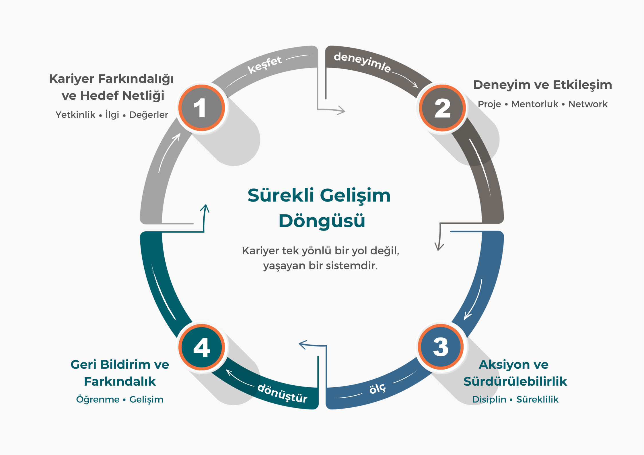 Aşağıda yer alan grafikte O’Mentor programının sürekli gelişim döngüsünün oluşturan 4 temel yapısal boyutu ve bu boyutların detayları yer almaktadır. Sürekli gelişim döngüsünün ilk boyutu öğrencilerimizin “Kariyer Farkındalığı ve Hedef Netliği” kazanmalarının sağlanmasını içermektedir. “Deneyim ve Etkileşim” boyutu aşamasında öğrencilerimizin iş yaşamını deneyimlemeleri ve profesyonel bir etkileşime girmeleri hedeflenmektedir. Üçüncü boyutta, deneyimlerin ve etkileşimlerin somut çıktılara dönüştürüldüğü ve ölçüldüğü “Aksiyon ve Sürdürülebilirlik” aşamasının gerçekleşmesi hedeflenmektedir. Son olarak, ilk üç boyutun kazanımlarının sonucunda mentorün nihai geri bildirimleri ve iyileştirme alanlarının gözden geçirildiği aşama ile programın döngüsel olarak tamamlanması hedeflenmektedir.