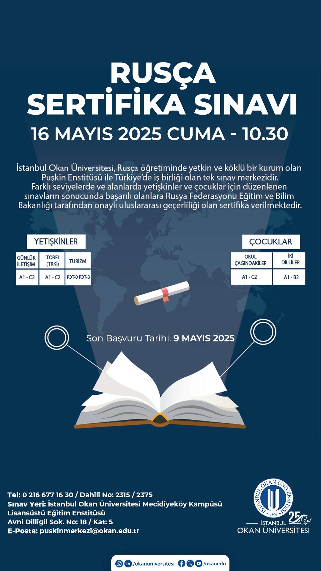 İstanbul Okan Üniversitesi, merkezi Moskova'da bulunan Puşkin Devlet Rus Dili Enstitüsü’nün Türkiye'deki tek yetkili sınav merkezidir.