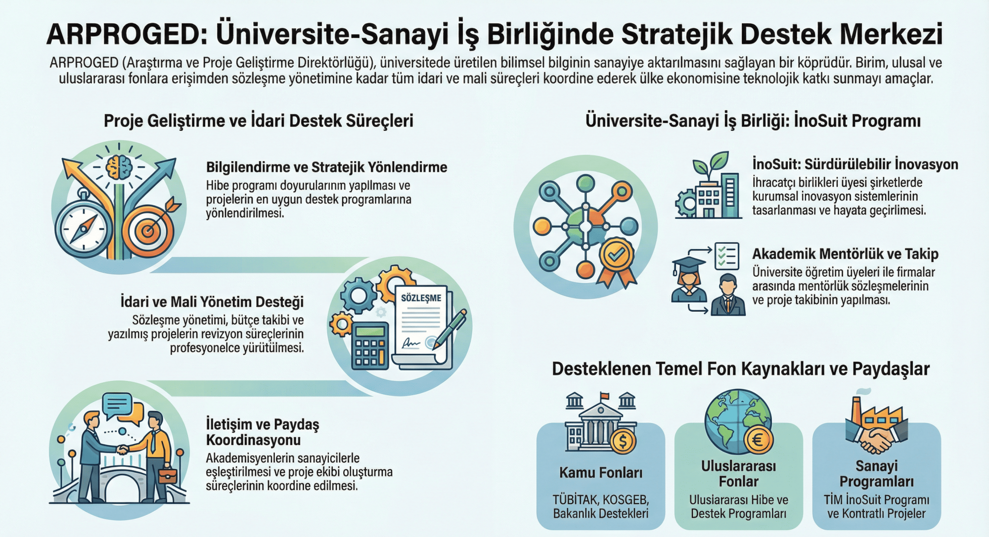Araştırma ve Proje Geliştirme Direktörlüğü - ARPROGED olarak, üniversitemiz akademisyen ve öğrencilerine ulusal-uluslararası hibe destek programlarına katılımının arttırılması ve yararlanabilmesi amacıyla bilgilendirme faaliyetleri gerçekleştirmenin yanı sıra, proje geliştirme desteği ve idari destek verilmektedir.