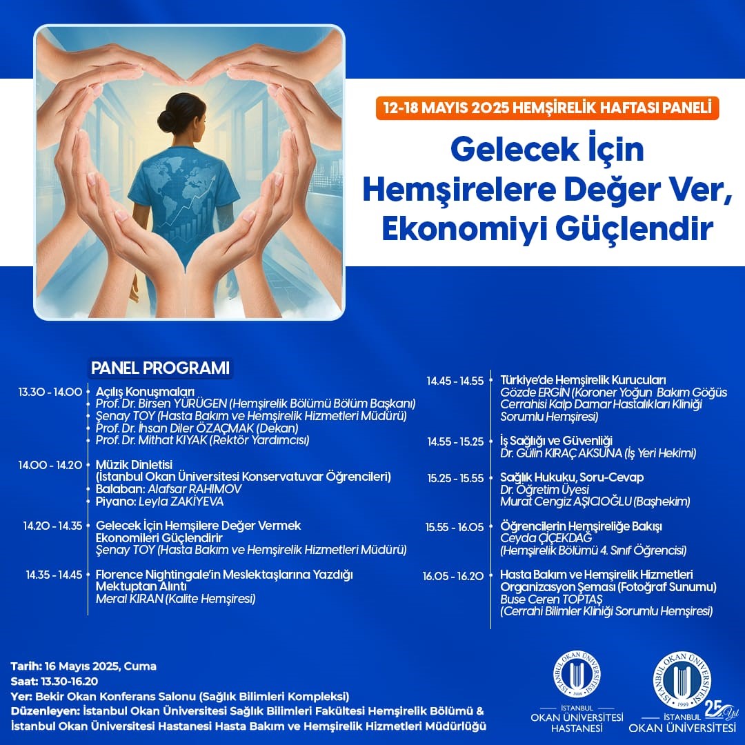 Hemşirelik Öğretim Üyelerimiz tarafından koordine edilen İstanbul Okan Üniversitesi Hastanesi ile işbirliği kapsamında Hemşirelik Haftası, 14.05.2025 tarihinde “ Hemşirelerimiz Geleceğimiz” konferansı gerçekleştirilmiştir.
