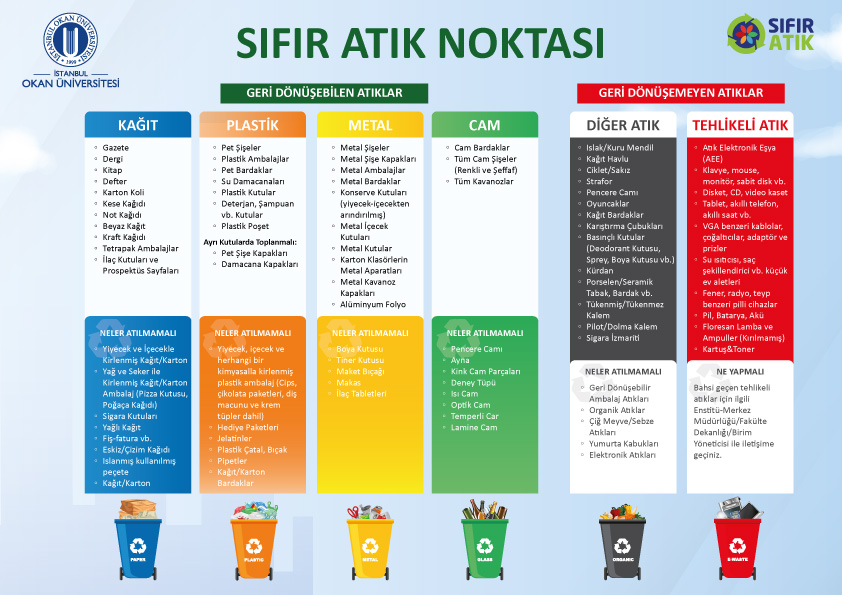 T.C. Çevre ve Şehircilik Bakanlığı tarafından Haziran 2017’de sürdürülebilir kalkınma ilkeleri çerçevesinde, atıkları kontrol altına almak ve gelecek nesillere temiz, gelişmiş ve yaşanabilir bir dünya bırakmak amacıyla uygulanmaya başlatılan Sıfır Atık projesine İstanbul Okan Üniversitesi olarak biz de destek veriyoruz.