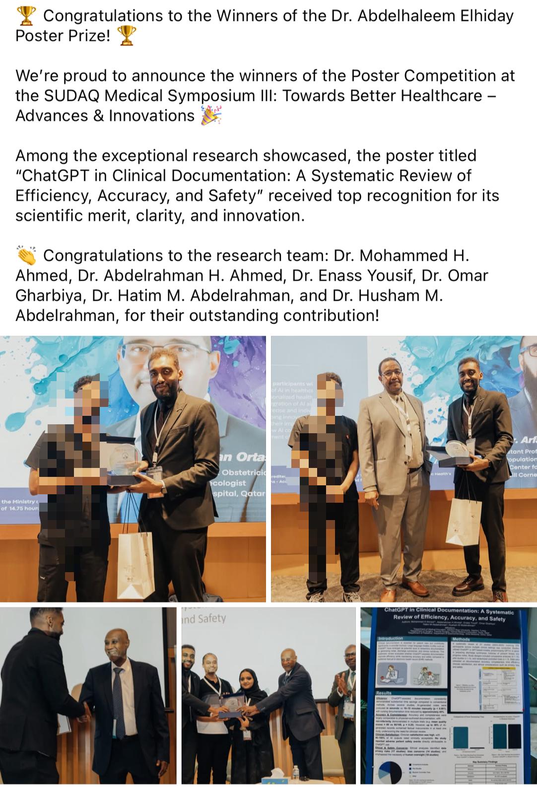 Fakültemiz öğrencileri, bilimsel araştırma alanında önemli bir başarıya imza attı. Üniversitemizi temsil eden araştırma ekibi, SUDAQ Medical Symposium III: Towards Better Healthcare – Advances & Innovations etkinliğinde, “ChatGPT in Clinical Documentation: A Systematic Review of Efficiency, Accuracy, and Safety” başlıklı projeleriyle “En İyi Poster Ödülü (Dr. Abdelhaleem Elhiday Prize)” kazandı.