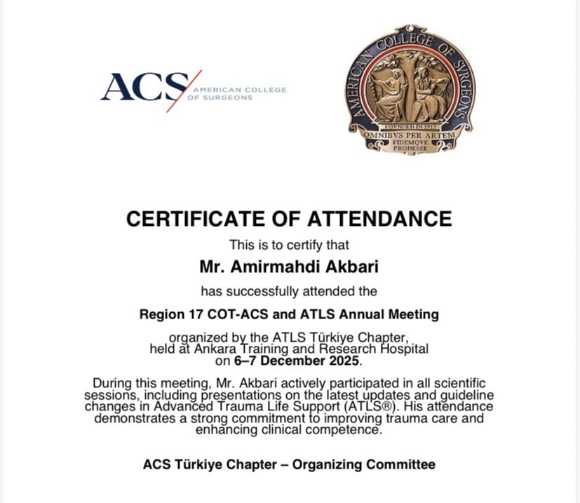 Üniversitemiz Tıp Fakültesi öğrencilerinden Amir Mahdi Akbari, American College of Surgeons (ACS) tarafından özel olarak davet edildiği Region 17 COT-ACS & ATLS Annual Meeting toplantısına katılım sağladı.